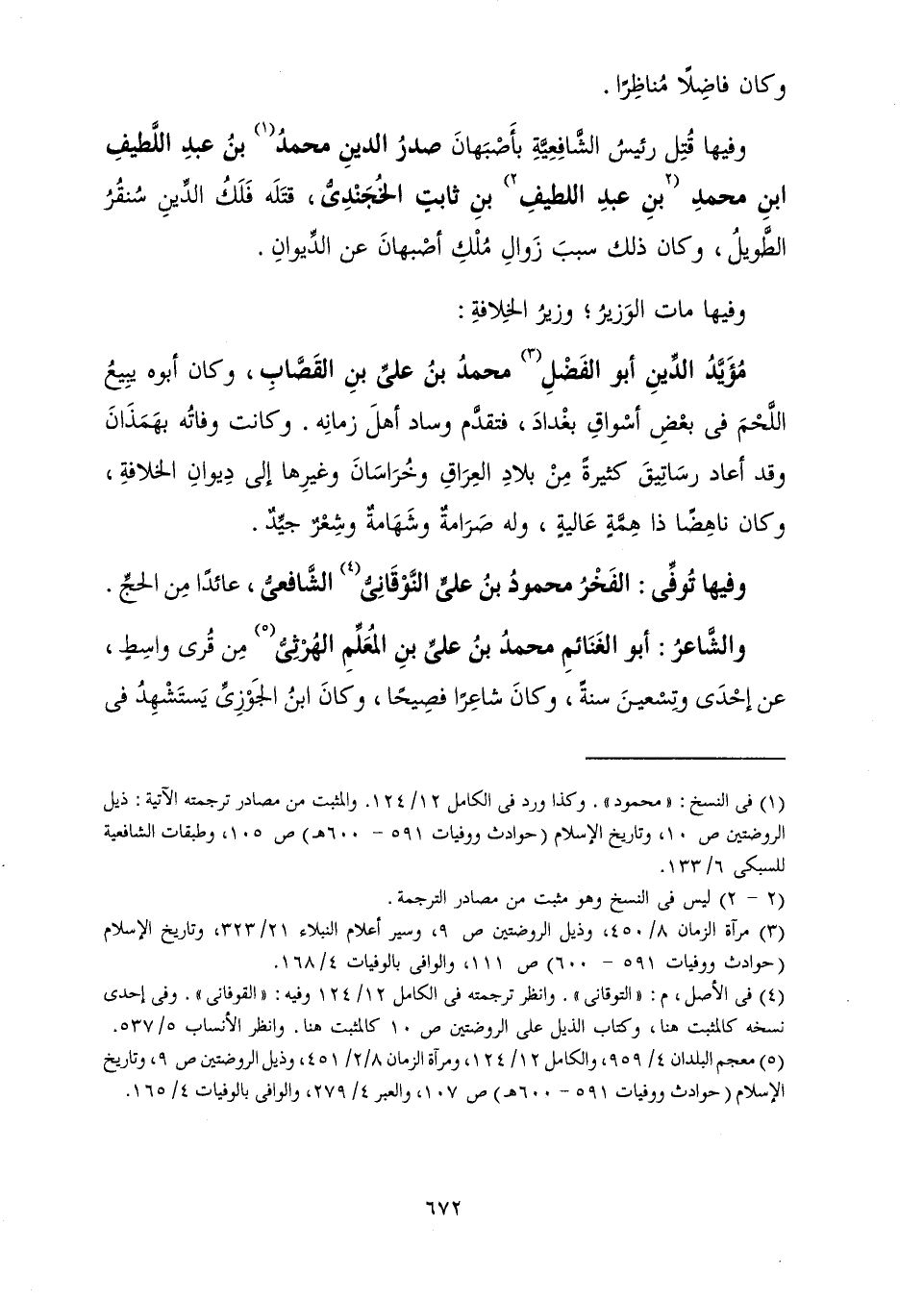وَفِيهَا قُتِلَ رَئِيسُ الشَّافِعِيَّةِ بِأَصْبَهَانَ صَدْرُ الدِّينِ مُحَمَّدُ بْنُ عَبْدِ اللَّطِيفِ بْنِ مُحَمَّدِ بْنِ عَبْدِ اللَّطِيفِ بْنِ ثَابِتٍ الْخُجَنْدِيُّ، قَتَلَهُ فَلَكُ الدِّينِ سُنْقُرُ الطَّوِيلُ، وَكَانَ ذَلِكَ سَبَبَ زَوَالِ مُلْكِ أَصْبَهَانَ عَنِ الدِّيوَانِ.