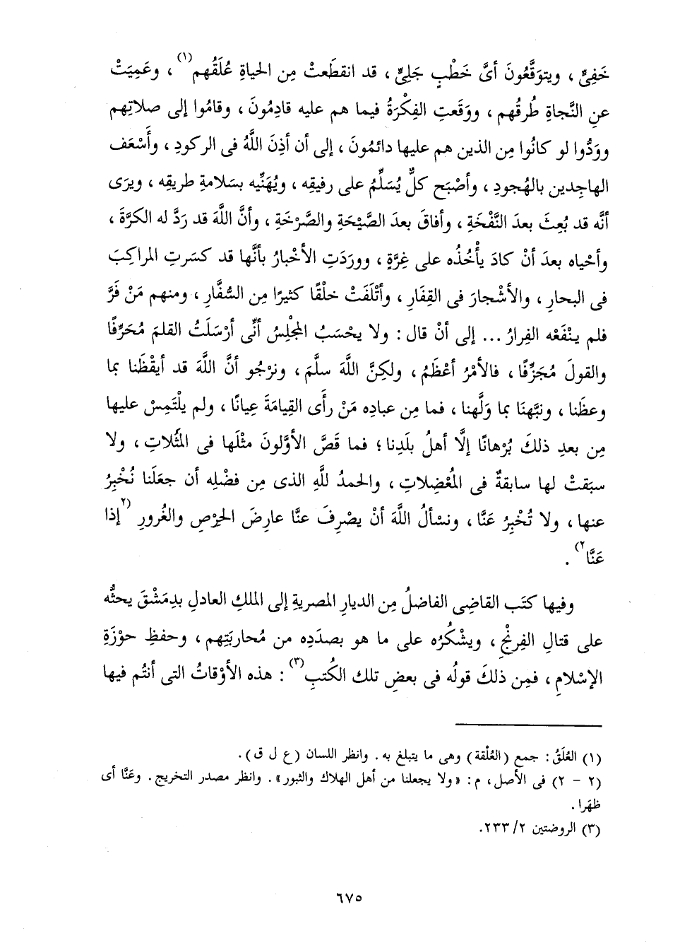 خَفِيٍّ، وَيَتَوَقَّعُونَ أَيَّ خَطْبٍ جَلِيٍّ، قَدِ انْقَطَعَتْ مِنَ الْحَيَاةِ عُلَقُهُمْ، وَعَمِيَتْ عَنِ النَّجَاةِ طُرُقُهُمْ، وَوَقَعَتِ الْفِكْرَةُ فِيمَا هُمْ عَلَيْهِ قَادِمُونَ، وَقَامُوا إِلَى صَلَاتِهِمْ، وَوَدُّوا لَوْ كَانُوا مِنَ الَّذِينَ هُمْ عَلَيْهَا دَائِمُونَ إِلَى أَنْ أَذِنَ اللَّهُ فِي الرُّكُودِ، وَأَسْعَفَ الْهَاجِدِينَ بِالْهُجُودِ، وَأَصْبَحَ كُلٌّ يُسَلِّمُ عَلَى رَفِيقِهِ، وَيُهَنِّيهِ بِسَلَامَةِ طَرِيقِهِ، وَيَرَى أَنَّهُ قَدْ بُعِثَ بَعْدَ النَّفْخَةِ، وَأَفَاقَ بَعْدَ الصَّيْحَةِ، وَالصَّرْخَةِ، وَأَنَّ اللَّهَ قَدْ رَدَّ لَهُ الْكَرَّةَ، وَأَحْيَاهُ بَعْدَ أَنْ كَادَ يَأْخُذُهُ عَلَى غِرَّةٍ، وَوَرَدَتِ الْأَخْبَارُ بِأَنَّهَا قَدْ كَسَرَتِ الْمَرَاكِبَ فِي الْبِحَارِ، وَالْأَشْجَارَ فِي الْقِفَارِ، وَأَتْلَفَتْ خَلْقًا كَثِيرًا مِنِ السُّفَّارِ، وَمِنْهُمْ مَنْ فَرَّ فَلَمْ يَنْفَعْهُ الْفِرَارُ. . . إِلَى أَنْ قَالَ: وَلَا يَحْسَبُ الْمَجْلِسُ أَنِّي أَرْسَلْتُ الْقَلَمَ مُحَرِّفًا، وَالْقَوْلَ مُجَزِّفًا، فَالْأَمْرُ أَعْظَمُ، وَلَكِنَّ اللَّهَ سَلَّمَ، وَنَرْجُو أَنَّ اللَّهَ قَدْ أَيْقَظْنَا بِمَا وَعَظَنَا، وَنَبَّهْنَا بِمَا وَلَّهَنَا، فَمَا مِنْ عِبَادِهِ مَنْ رَأَى الْقِيَامَةَ عِيَانًا، وَلَمْ يَلْتَمِسْ عَلَيْهَا مِنْ بَعْدِ ذَلِكَ بُرْهَانًا إِلَّا أَهْلُ بَلَدِنَا ; فَمَا قَصَّ الْأَوَّلُونَ مِثْلَهَا فِي الْمُثُلَاتِ، وَلَا سَبَقَتْ لَهَا سَابِقَةٌ فِي الْمُعْضِلَاتِ، وَالْحَمْدُ لِلَّهِ الَّذِي مِنْ فَضْلِهِ قَدْ جَعَلَنَا نُخْبِرُ عَنْهَا، وَلَا تُخْبِرُ عَنَّا، وَنَسْأَلُ اللَّهَ أَنْ يَصْرِفَ عَنَّا عَارِضَ الْحِرْصِ وَالْغُرُورِ إِذَا عَنَّا