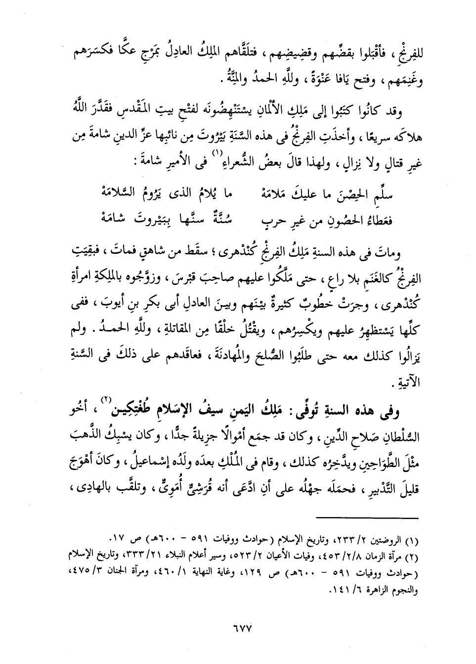 وَمَاتَ فِي هَذِهِ السَّنَةِ مَلِكُ الْفِرِنْجِ كُنْدَهِرِيٌّ ; سَقَطَ مِنْ شَاهِقٍ فَمَاتَ، فَبَقِيَتِ الْفِرِنْجُ كَالْغَنَمِ بِلَا رَاعٍ، حَتَّى مَلَّكُوا عَلَيْهِمْ صَاحِبَ قُبْرُسَ وَزَوَّجُوهُ بِالْمَلِكَةِ امْرَأَةِ كُنْدَهِرِيٍّ، وَجَرَتْ خُطُوبٌ كَثِيرَةٌ بَيْنَهُمْ وَبَيْنَ الْعَادِلِ أَبِي بَكْرِ بْنِ أَيُّوبَ، فَفِي كُلِّهَا يَسْتَظْهِرُ عَلَيْهِمْ وَيَكْسِرَهُمْ، وَيَقْتُلُ خَلْقًا مِنَ الْمُقَاتِلَةِ؛ وَلِلَّهِ الْحَمْدُ. وَلَمْ يَزَالُوا كَذَلِكَ مَعَهُ حَتَّى طَلَبُوا الصُّلْحَ وَالْمُهَادَنَةَ، فَعَاقَدَهُمْ عَلَى ذَلِكَ فِي السَّنَةِ الْآتِيَةِ.
