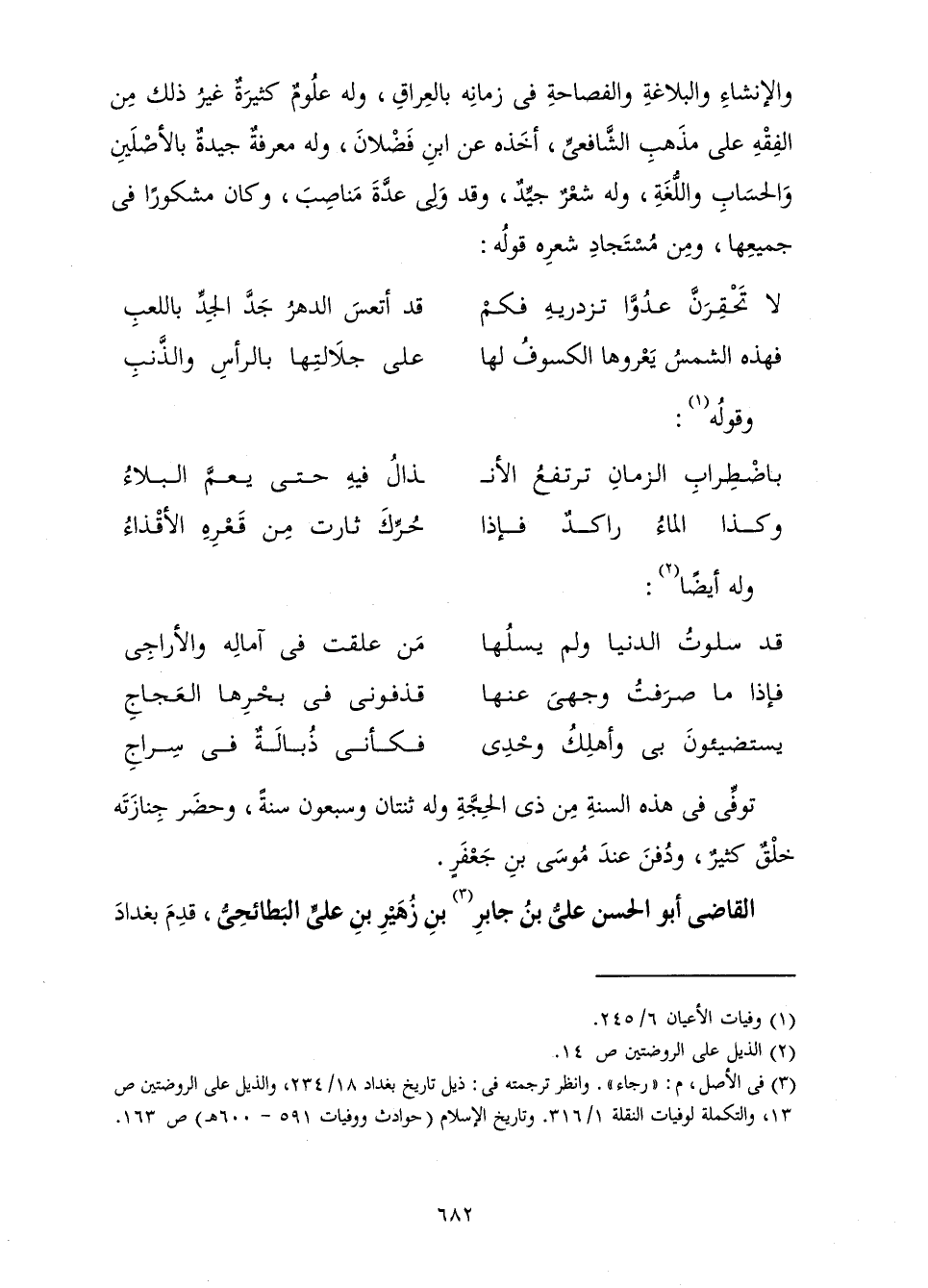 الْقَاضِي أَبُو الْحَسَنِ عَلِيُّ بْنُ جَابِرِ بْنِ زُهَيْرِ بْنِ عَلِيٍّ الْبَطَائِحِيُّ.
