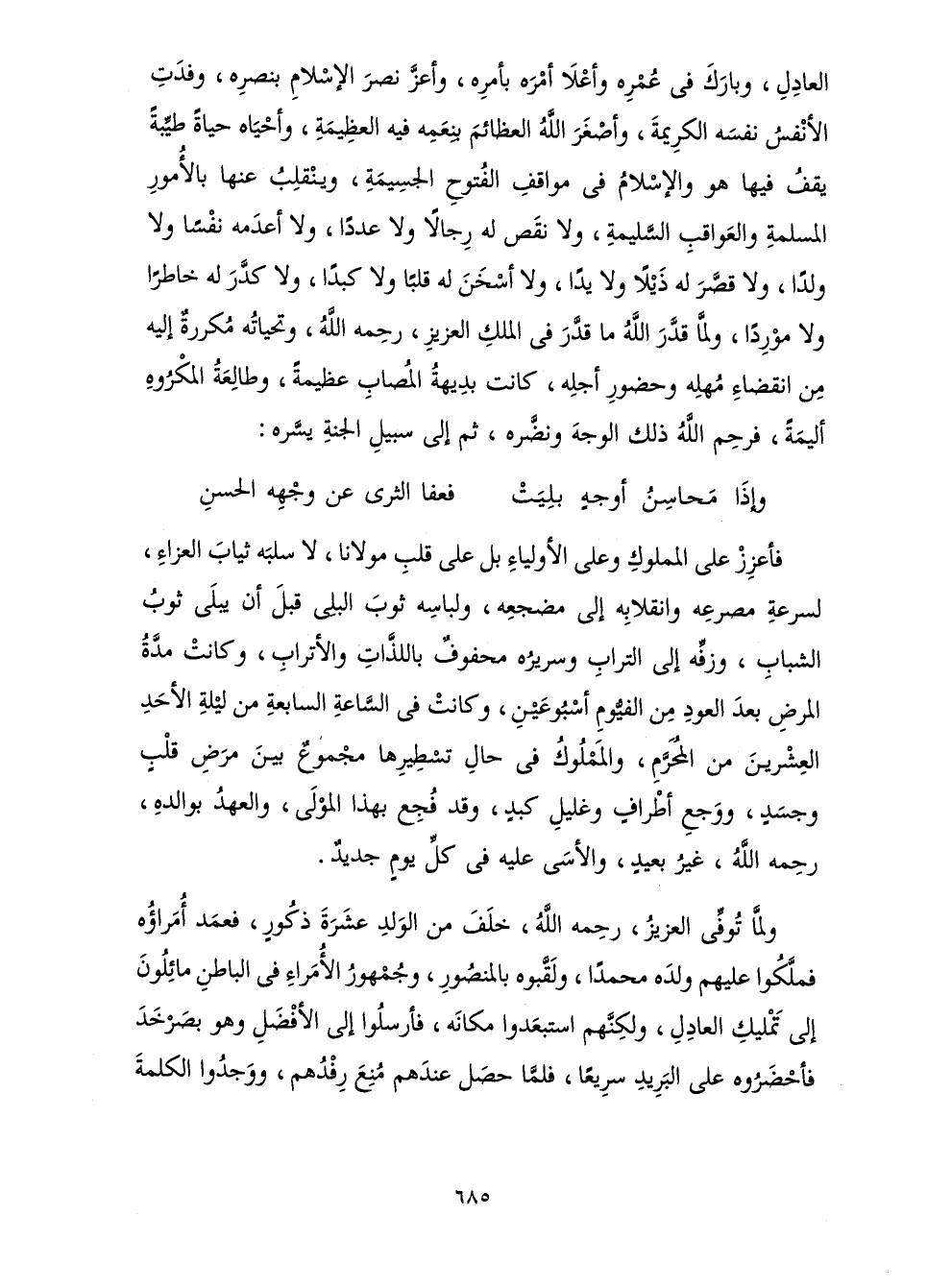 الْعَادِلِ، وَبَارَكَ فِي عُمْرِهِ وَأَعْلَا أَمْرَهُ بِأَمْرِهِ، وَأَعَزَّ نَصْرَ الْإِسْلَامِ بِنَصْرِهِ، وَفَدَتِ الْأَنْفُسُ نَفْسَهُ الْكَرِيمَةَ، وَأَصْغَرَ اللَّهُ الْعَظَائِمَ بِنِعَمِهِ فِيهِ الْعَظِيمَةِ، وَأَحْيَاهُ حَيَاةً طَيِّبَةً يَقِفُ فِيهَا هُوَ وَالْإِسْلَامُ فِي مَوَاقِفِ الْفُتُوحِ الْجَسِيمَةِ، وَيَنْقَلِبُ عَنْهَا بِالْأُمُورِ الْمُسْلِمَةِ وَالْعَوَاقِبِ السَّلِيمَةِ، وَلَا نَقَصَ لَهُ رِجَالًا وَلَا عَدَدًا، وَلَا أَعْدَمَهُ نَفْسًا وَلَا وَلَدًا، وَلَا قَصَّرَ لَهُ ذَيْلًا وَلَا يَدًا، وَلَا أَسْخَنَ لَهُ قَلْبًا وَلَا كَبِدًا، وَلَا كَدَّرَ لَهُ خَاطِرًا وَلَا مَوْرِدًا، وَلَمَّا قَدَّرَ اللَّهُ مَا قَدَّرَ فِي الْمَلِكِ الْعَزِيزِ؛ رَحِمَهُ اللَّهُ، وَتَحِيَّاتُهُ مُكَرَّرَةٌ إِلَيْهِ مِنَ انْقِضَاءِ مُهْلِهِ وَحُضُورِ أَجَلِهِ، كَانَتْ بَدِيهَةُ الْمُصَابِ عَظِيمَةً، وَطَالِعَةُ الْمَكْرُوهِ أَلِيمَةً، فَرَحِمَ اللَّهُ ذَلِكَ الْوَجْهَ وَنَضَّرَهُ، ثُمَّ إِلَى سَبِيلِ الْجَنَّةِ يَسَّرَهُ
