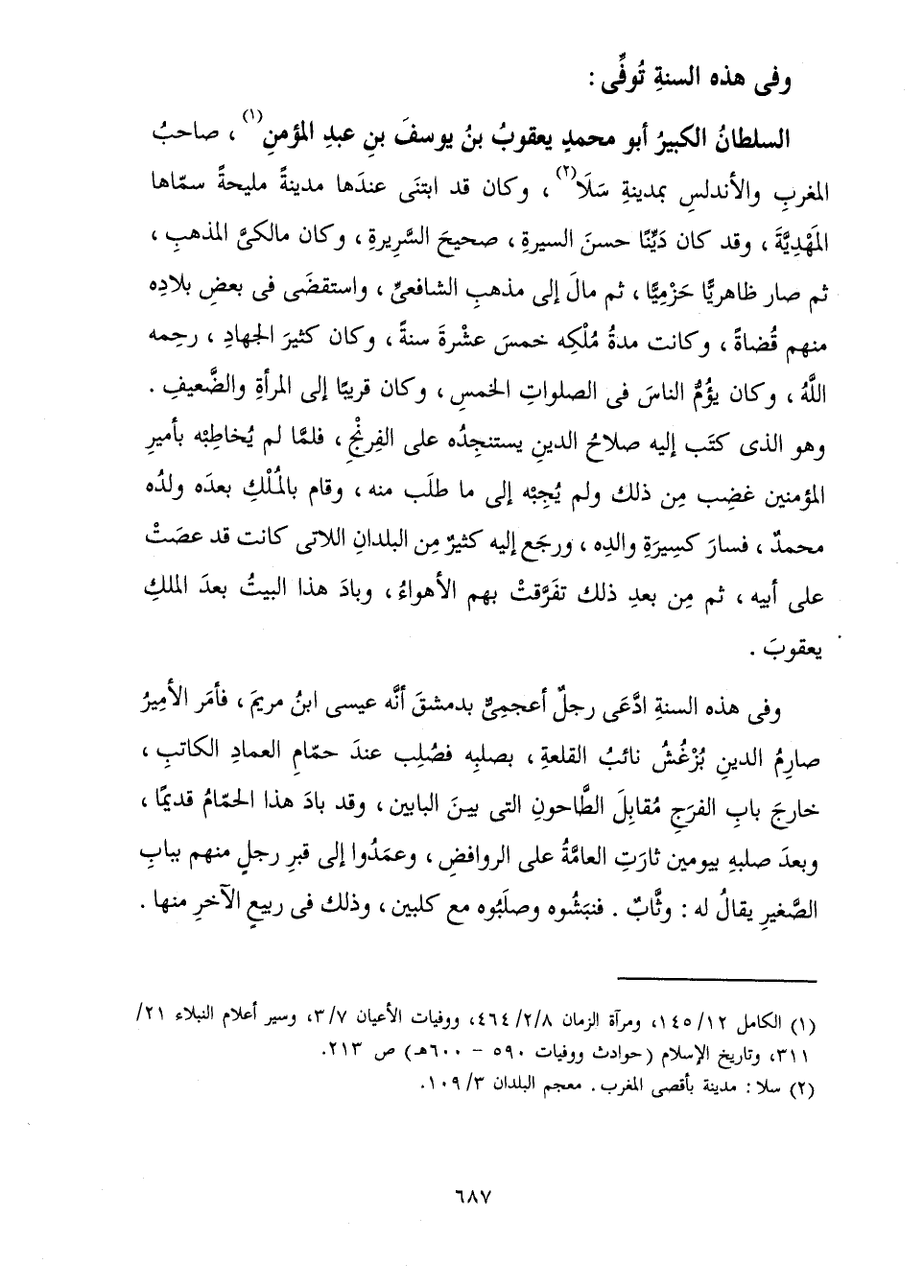، صَاحِبُ الْمَغْرِبِ وَالْأَنْدَلُسِ بِمَدِينَتِهِ سَلَا، وَكَانَ قَدِ ابْتَنَى عِنْدَهَا مَدِينَةً مَلِيحَةً سَمَّاهَا الْمَهْدِيَّةَ، وَقَدْ كَانَ دَيِّنًا حَسَنَ السِّيرَةِ، صَحِيحَ السَّرِيرَةِ، وَكَانَ مَالِكِيَّ الْمَذْهَبِ، ثُمَّ صَارَ ظَاهِرِيًّا حَزْمِيًّا، ثُمَّ مَالَ إِلَى مَذْهَبِ الشَّافِعِيِّ، وَاسْتَقْضَى فِي بَعْضِ بِلَادِهِ مِنْهُمْ قُضَاةً، وَكَانَتْ مُدَّةُ مُلْكِهِ خَمْسَ عَشْرَةَ سَنَةً، وَكَانَ كَثِيرَ الْجِهَادِ؛ رَحِمَهُ اللَّهُ، وَكَانَ يَؤُمُّ النَّاسَ فِي الصَّلَوَاتِ الْخَمْسِ، وَكَانَ قَرِيبًا إِلَى الْمَرْأَةِ وَالضَّعِيفِ، وَهُوَ الَّذِي كَتَبَ إِلَيْهِ صَلَاحُ الدِّينِ يَسْتَنْجِدُهُ عَلَى الْفِرِنْجِ، فَلَمَّا لَمْ يُخَاطِبْهُ بِأَمِيرِ الْمُؤْمِنِينَ غَضِبَ مِنْ ذَلِكَ، وَلَمْ يُجِبْهُ إِلَى مَا طَلَبَ مِنْهُ، وَقَامَ بِالْمُلْكِ بَعْدَهُ وَلَدُهُ مُحَمَّدٌ، فَسَارَ كَسِيرَةِ وَالِدِهِ، وَرَجَعَ إِلَيْهِ كَثِيرٌ مِنَ الْبُلْدَانِ اللَّاتِي كَانَتْ قَدْ عَصَتْ عَلَى أَبِيهِ، ثُمَّ مِنْ بَعْدِ ذَلِكَ تَفَرَّقَتْ بِهِمُ الْأَهْوَاءُ، وَبَادَ هَذَا الْبَيْتُ بَعْدَ الْمَلِكِ يَعْقُوبَ.