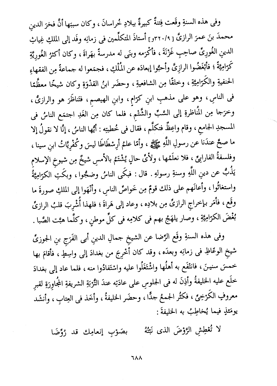 وَفِي هَذِهِ السَّنَةِ وَقَعَتْ فِتْنَةٌ كَبِيرَةٌ بِبِلَادِ خُرَاسَانَ وَكَانَ سَبَبُهَا أَنَّ فَخْرَ الدِّينِ مُحَمَّدَ بْنَ عُمَرَ الرَّازِيَّ أُسْتَاذَ الْمُتَكَلِّمِينَ فِي زَمَانِهِ وَفَدَ إِلَى الْمَلِكِ غِيَاثِ الدِّينِ الْغُورِيِّ صَاحِبِ غَزْنَةَ، فَأَكْرَمَهُ وَبَنَى لَهُ مَدْرَسَةً بِهَرَاةَ، وَكَانَ أَكْثَرُ الْغُورِيَّةِ كَرَّامِيَّةً ; فَأَبْغَضُوا الرَّازِيَّ وَأَحَبُّوا إِبْعَادَهُ عَنِ الْمَلِكِ، فَجَمَعُوا لَهُ جَمَاعَةً مِنَ الْفُقَهَاءِ الْحَنَفِيَّةِ وَالْكَرَّامِيَّةِ، وَخَلْقًا مِنَ الشَّافِعِيَّةِ، وَحَضَرَ ابْنُ الْقَدْوَةِ، وَكَانَ شَيْخًا مُعَظَّمًا فِي النَّاسِ، وَهُوَ عَلَى مَذْهَبِ ابْنِ كِرَامٍ وَابْنِ الْهَيْصَمِ، فَتَنَاظَرَ هُوَ وَالرَّازِيُّ، وَخَرَجَا مِنَ الْمُنَاظَرَةِ إِلَى السَّبِّ وَالشَّتْمِ، فَلَمَّا كَانَ مِنَ الْغَدِ اجْتَمَعَ النَّاسُ فِي الْمَسْجِدِ الْجَامِعِ، وَقَامَ وَاعِظٌ فَتَكَلَّمَ، فَقَالَ فِي خُطْبَتِهِ: أَيُّهَا النَّاسُ إِنَّا لَا نَقُولُ إِلَّا مَا صَحَّ عِنْدَنَا عَنْ رَسُولِ اللَّهِ صَلَّى اللَّهُ عَلَيْهِ وَسَلَّمَ، وَأَمَّا عِلْمُ أَرِسْطَاطَالِيسَ وَكُفْرِيَّاتُ ابْنِ سِينَا وَفَلْسَفَةُ الْفَارَابِيِّ، فَلَا نَعْلَمُهَا، وَلِأَيِّ حَالٍ يُشْتَمُ بِالْأَمْسِ شَيْخٌ مِنْ شُيُوخِ الْإِسْلَامِ، يَذُبُّ عَنْ دِينِ اللَّهِ وَسُنَّةِ رَسُولِهِ. قَالَ: فَبَكَى النَّاسُ وَضَجُّوا، وَبَكَتِ الْكَرَّامِيَّةُ وَاسْتَغَاثُوا، وَأَعَانَهُمْ عَلَى ذَلِكَ قَوْمٌ مِنْ خَوَاصِّ النَّاسِ، وَأَنْهَوْا إِلَى الْمَلِكِ صُورَةَ مَا وَقَعَ، فَأَمَرَ بِإِخْرَاجِ الرَّازِيِّ مِنْ بِلَادِهِ، وَعَادَ إِلَى هَرَاةَ ; فَلِهَذَا أُشْرِبَ قَلْبُ الرَّازِيِّ بُغْضَ الْكَرَّامِيَّةِ، وَصَارَ يَلْهَجُ بِهِمْ فِي كَلَامِهِ فِي كُلِّ مَوْطِنٍ، وَكُلَّمَا هَبَّتِ الصَّبَا.