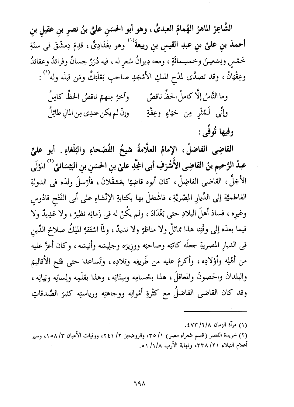 أَبِي الْمَجْدِ عَلِيِّ بْنِ الْحَسَنِ بْنِ الْبَيْسَانِيِّ الْمَوْلَى الْأَجَلُّ الْقَاضِي الْفَاضِلُ، كَانَ أَبُوهُ قَاضِيًا بِعَسْقَلَانَ، فَأَرْسَلَ وَلَدَهُ فِي الدَّوْلَةِ الْفَاطِمِيَّةِ إِلَى الدِّيَارِ الْمِصْرِيَّةِ، فَاشْتَغَلَ بِهَا بِكِتَابَةِ الْإِنْشَاءِ عَلَى أَبِي الْفَتْحِ قَادُوسَ وَغَيْرِهِ، فَسَادَ أَهْلُ الْبِلَادِ حَتَّى بَغْدَادَ وَلَمْ يَكُنْ لَهُ فِي زَمَانِهِ نَظِيرٌ، وَلَا عَدِيدٌ وَلَا فِيمَا بَعْدَهُ إِلَى وَقْتِنَا هَذَا مُمَاثِلٌ وَلَا مُنَاظِرٌ وَلَا نَدِيدٌ، وَلَمَّا اسْتَقَرَّ الْمَلِكُ صَلَاحُ الدِّينِ فِي الدِّيَارِ الْمِصْرِيَّةِ جَعَلَهُ كَاتِبَهُ وَصَاحِبَهُ وَوَزِيرَهُ وَجَلِيسَهُ وَأَنِيسَهُ، وَكَانَ أَعَزَّ عَلَيْهِ مِنْ أَهْلِهِ وَأَوْلَادِهِ، وَأَكْرَمَ عَلَيْهِ مِنْ طَرِيفِهِ وَتِلَادِهِ، وَتَسَاعَدَا حَتَّى فَتَحَ الْأَقَالِيمَ وَالْبُلْدَانَ وَالْحُصُونَ وَالْمَعَاقِلَ، هَذَا بِحُسَامِهِ وَسِنَانِهِ، وَهَذَا بِقَلَمِهِ وَلِسَانِهِ وَبَيَانِهِ، وَقَدْ كَانَ الْقَاضِي الْفَاضِلُ مِنْ كَثْرَةِ أَمْوَالِهِ وَوَجَاهَتِهِ وَرِيَاسَتِهِ كَثِيرَ الصَّدَقَاتِ