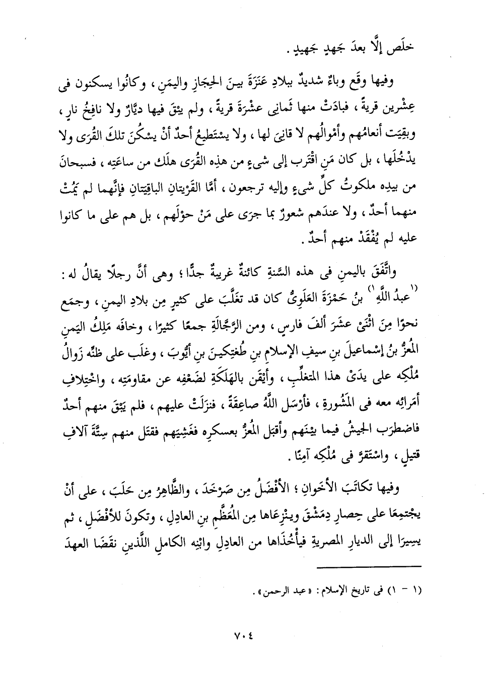 وَفِيهَا وَقَعَ وَبَاءٌ شَدِيدٌ بِبِلَادِ عَنَزَةَ بَيْنَ الْحِجَازِ وَالْيَمَنِ، وَكَانُوا يَسْكُنُونَ فِي عِشْرِينَ قَرْيَةً، فَبَادَتْ مِنْهَا ثَمَانِي عَشْرَةَ قَرْيَةً، وَلَمْ يَبْقَ فِيهَا دَيَّارٌ وَلَا نَافِخُ نَارٍ، وَبَقِيَتْ أَنْعَامُهُمْ وَأَمْوَالُهُمْ لَا قَانِيَ لَهَا، وَلَا يَسْتَطِيعُ أَحَدٌ أَنْ يَسْكُنَ تِلْكَ الْقُرَى وَلَا يَدْخُلَهَا، بَلْ كَانَ مَنِ اقْتَرَبَ إِلَى شَيْءٍ مِنْ هَذِهِ الْقُرَى هَلَكَ مِنْ سَاعَتِهِ، فَسُبْحَانَ مَنْ بِيَدِهِ مَلَكُوتُ كُلِّ شَيْءٍ وَإِلَيْهِ تُرْجِعُونَ، أَمَّا الْقَرْيَتَانِ الْبَاقِيَتَانِ فَإِنَّهُمَا لَمْ يَمُتْ مِنْهُمَا أَحَدٌ وَلَا عِنْدَهُمْ شُعُورٌ بِمَا جَرَى عَلَى مَنْ حَوْلَهُمْ؛ بَلْ هُمْ عَلَى مَا كَانُوا عَلَيْهِ لَمْ يُفْقَدْ مِنْهُمْ أَحَدٌ.