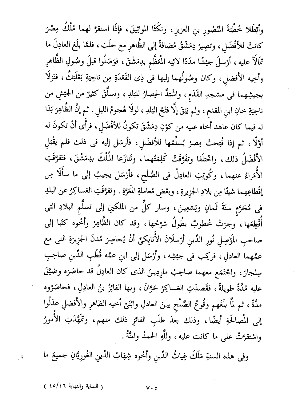 وَأَبْطَلَا خُطْبَةَ الْمَنْصُورِ بْنِ عَبْدِ الْعَزِيزِ، وَنَكَثَا الْمَوَاثِيقَ، فَإِذَا اسْتَقَرَّ لَهُمَا مُلْكُ مِصْرَ كَانَتْ لِلْأَفْضَلِ، وَتَصِيرُ دِمَشْقُ مُضَافَةً إِلَى الظَّاهِرِ مَعَ حَلَبَ فَلَمَّا بَلَغَ الْعَادِلَ مَا تَمَالَآ عَلَيْهِ، أَرْسَلَ جَيْشًا مَدَدًا لِابْنِهِ الْمُعَظَّمِ بِدِمَشْقَ، فَوَصَلُوا قَبْلَ وُصُولِ الظَّاهِرِ وَأَخِيهِ الْأَفْضَلِ، وَكَانَ وُصُولُهُمَا إِلَيْهَا فِي ذِي الْقَعْدَةِ مِنْ نَاحِيَةِ بَعْلَبَكَّ فَنَزَلَا بِجَيْشِهِمَا فِي مَسْجِدِ الْقَدَمِ، وَاشْتَدَّ الْحِصَارُ لِلْبَلَدِ، وَتَسَلَّقَ كَثِيرٌ مِنَ الْجَيْشِ مِنْ نَاحِيَةِ خَانِ ابْنِ الْمُقَدَّمِ، وَلَمْ يَبْقَ إِلَّا فَتْحُ الْبَلَدِ، لَوْلَا هُجُومُ اللَّيْلِ. ثُمَّ إِنَّ الظَّاهِرَ بَدَا لَهُ فِيمَا كَانَ عَاهَدَ أَخَاهُ عَلَيْهِ مِنْ كَوْنِ دِمَشْقَ تَكُونُ لِلْأَفْضَلِ، فَرَأَى أَنْ تَكُونَ لَهُ أَوَّلًا، ثُمَّ إِذَا فُتِحَتْ مِصْرُ يُسَلِّمُهَا لِلْأَفْضَلِ، فَأَرْسَلَ إِلَيْهِ فِي ذَلِكَ فَلَمْ يَقْبَلِ الْأَفْضَلُ ذَلِكَ، وَاخْتَلَفَا وَتَفَرَّقَتْ كَلِمَتُهُمَا، وَتَنَازَعَا عَلَى الْمُلْكِ بِدِمَشْقَ، فَتَفَرَّقَتِ الْأُمَرَاءُ عَنْهُمَا، وَكُوتِبَ الْعَادِلُ فِي الصُّلْحِ، فَأَرْسَلَ يُجِيبُ إِلَى مَا سَأَلَا مِنْ إِقْطَاعِهِمَا شَيْئًا مِنْ بِلَادِ الْجَزِيرَةِ وَبَعْضِ مُعَامَلَةِ الْمَعَرَّةِ. وَتَفَرَّقَتِ الْعَسَاكِرُ عَنِ الْبَلَدِ فِي مُحَرَّمٍ سَنَةَ ثَمَانٍ وَتِسْعِينَ، وَسَارَ كُلٌّ مِنَ الْمَلِكَيْنِ إِلَى تَسَلُّمِ الْبِلَادِ الَّتِي أُقْطِعَهَا، وَجَرَتْ خُطُوبٌ يَطُولُ شَرْحُهَا، وَقَدْ كَانَ الظَّاهِرُ وَأَخُوهُ كَتَبَا إِلَى صَاحِبِ الْمَوْصِلِ نُورِ الدِّينِ أَرْسَلَانَ الْأَتَابِكِيِّ أَنْ يُحَاصِرَ مُدُنَ الْجَزِيرَةِ الَّتِي مَعَ عَمِّهِمَا الْعَادِلِ، فَرَكِبَ فِي جَيْشِهِ وَأَرْسَلَ إِلَى ابْنِ عَمِّهِ قُطْبِ الدِّينِ صَاحِبِ سِنْجَارَ، وَاجْتَمَعَ مَعَهُمَا صَاحِبُ مَارِدِينَ الَّذِي كَانَ الْعَادِلُ قَدْ حَاصَرَهُ وَضَيَّقَ عَلَيْهِ مُدَّةً طَوِيلَةً، فَقَصَدَتِ الْعَسَاكِرُ حَرَّانَ وَبِهَا الْفَائِزُ بْنُ الْعَادِلِ، فَحَاصَرُوهُ مُدَّةً، ثُمَّ لَمَّا بَلَغَهُمْ وُقُوعُ الصُّلْحِ بَيْنَ الْعَادِلِ وَابْنَيْ أَخِيهِ الظَّاهِرِ وَالْأَفْضَلِ عَدَلُوا إِلَى الْمُصَالَحَةِ أَيْضًا، وَذَلِكَ بَعْدَ طَلَبِ الْفَائِزِ ذَلِكَ مِنْهُمْ، وَتَمَهَّدَتِ الْأُمُورُ وَاسْتَقَرَّتْ عَلَى مَا كَانَتْ عَلَيْهِ؛ وَلِلَّهِ الْحَمْدُ وَالْمِنَّةُ.
