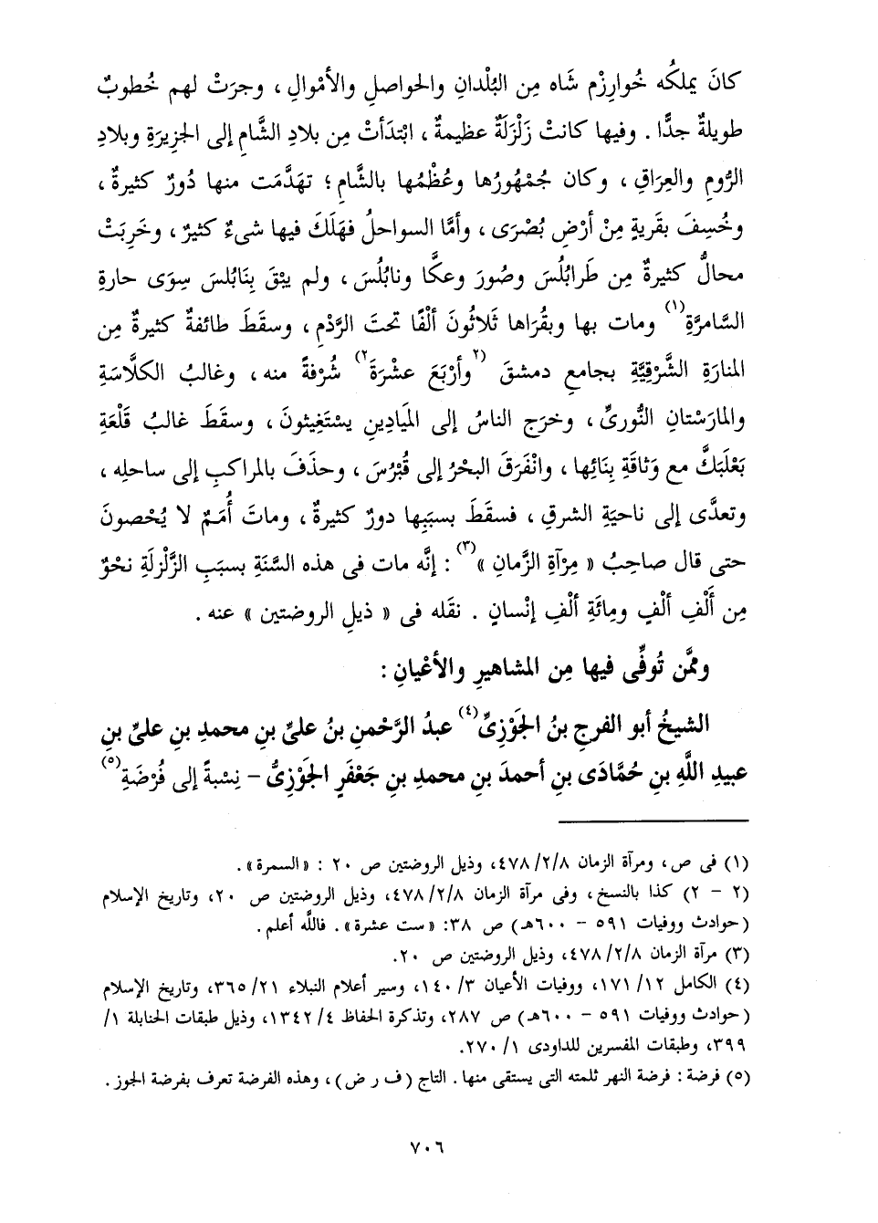 كَانَ يَمْلِكُهُ خُوَارِزْمُ شَاهْ مِنَ الْبُلْدَانِ وَالْحَوَاصِلِ وَالْأَمْوَالِ، وَجَرَتْ لَهُمْ خُطُوبٌ طَوِيلَةٌ جِدًّا. وَفِيهَا كَانَتْ زَلْزَلَةٌ عَظِيمَةٌ، ابْتَدَأَتْ مِنْ بِلَادِ الشَّامِ إِلَى الْجَزِيرَةِ وَبِلَادِ الرُّومِ وَالْعِرَاقِ، وَكَانَ جُمْهُورُهَا وَعُظْمُهَا بِالشَّامِ ; تَهَدَّمَتْ مِنْهَا دُورٌ كَثِيرَةٌ، وَخُسِفَ بِقَرْيَةٍ مِنْ أَرْضِ بُصْرَى، وَأَمَّا السَّوَاحِلُ فَهَلَكَ فِيهَا شَيْءٌ كَثِيرٌ، وَخَرِبَتْ مَحَالٌّ كَثِيرَةٌ مِنْ طَرَابُلُسَ وَصُورَ وَعَكَّا وَنَابُلُسَ، وَلَمْ يَبْقَ بِنَابُلُسَ سِوَى حَارَةِ السَّامَرَّةِ وَمَاتَ بِهَا وَبِقُرَاهَا ثَلَاثُونَ أَلْفًا تَحْتَ الرَّدْمِ، وَسَقَطَ طَائِفَةٌ كَثِيرَةٌ مِنَ الْمَنَارَةِ الشَّرْقِيَّةِ بِجَامِعِ دِمَشْقَ وَأَرْبَعَ عَشْرَةَ شُرْفَةً مِنْهُ، وَغَالِبُ الْكَلَّاسَةِ وَالْمَارَسْتَانِ النُّورِيِّ، وَخَرَجَ النَّاسُ إِلَى الْمَيَادِينِ يَسْتَغِيثُونَ، وَسَقَطَ غَالِبُ قَلْعَةِ بَعْلَبَكَّ مَعَ وَثَاقَةِ بِنَائِهَا، وَانْفَرَقَ الْبَحْرُ إِلَى قُبْرُسَ وَحَذَفَ بِالْمَرَاكِبِ إِلَى سَاحِلِهِ، وَتَعَدَّى إِلَى نَاحِيَةِ الشَّرْقِ، فَسَقَطَ بِسَبَبِهَا دُورٌ كَثِيرَةٌ، وَمَاتَ أُمَمٌ لَا يُحْصُونَ حَتَّى قَالَ صَاحِبُ " مِرْآةِ الزَّمَانِ ": إِنَّهُ مَاتَ فِي هَذِهِ السَّنَةِ بِسَبَبِ الزَّلْزَلَةِ نَحْوٌ مِنْ أَلْفِ أَلْفِ وَمِائَةِ أَلْفِ إِنْسَانٍ. نَقَلَهُ فِي " ذَيْلِ الرَّوْضَتَيْنِ " عَنْهُ.