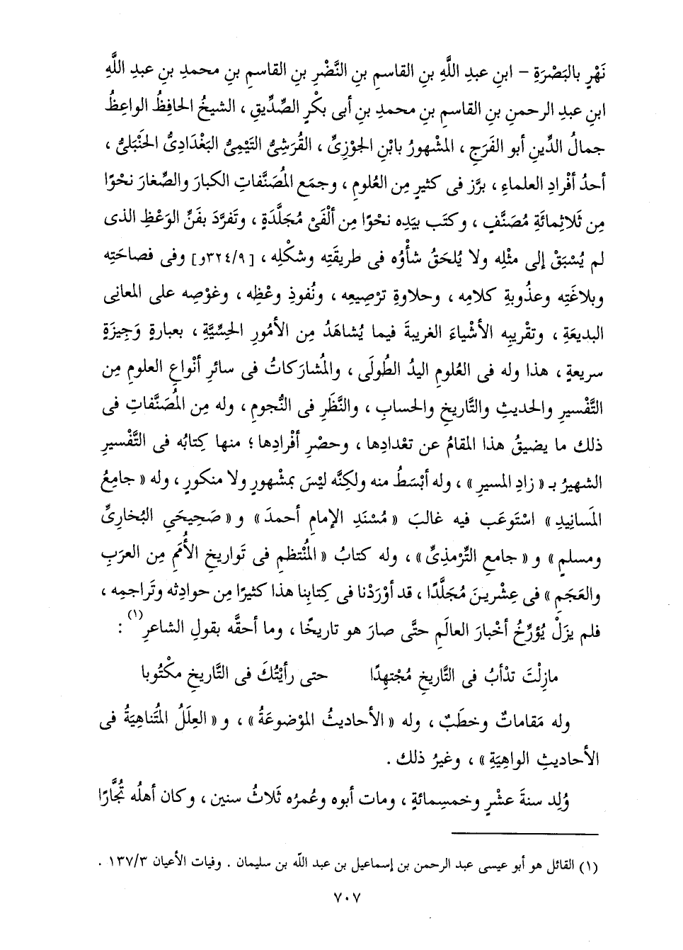 نَهْرٍ بِالْبَصْرَةِ - ابْنِ عَبْدِ اللَّهِ بْنِ الْقَاسِمِ بْنِ النَّضِرِ بْنِ الْقَاسِمِ بْنِ مُحَمَّدِ بْنِ عَبْدِ اللَّهِ بْنِ عَبْدِ الرَّحْمَنِ بْنِ الْقَاسِمِ بْنِ مُحَمَّدِ بْنِ أَبِي بَكْرٍ الصِّدِّيقِ، الشَّيْخُ الْحَافِظُ الْوَاعِظُ جَمَالُ الدِّينِ أَبُو الْفَرَجِ، الْمَشْهُورُ بِابْنِ الْجَوْزِيِّ، الْقُرَشِيُّ التَّيْمِيُّ الْبَغْدَادِيُّ الْحَنْبَلِيُّ، أَحَدُ أَفْرَادِ الْعُلَمَاءِ، بَرَزَ فِي كَثِيرٍ مِنَ الْعُلُومِ، وَجَمَعَ الْمُصَنَّفَاتِ الْكِبَارَ وَالصِّغَارَ نَحَوًا مِنْ ثَلَاثِمِائَةِ مُصَنَّفٍ، وَكَتَبَ بِيَدِهِ نَحْوًا مِنْ أَلْفَيْ مُجَلَّدَةٍ، وَتَفْرَّدَ بِفَنِّ الْوَعْظِ الَّذِي لَمْ يُسْبَقْ إِلَى مِثْلِهِ، وَلَا يُلْحَقُ شَأْوُهُ فِي طَرِيقَتِهِ وَشَكْلِهِ، وَفِي فَصَاحَتِهِ وَبَلَاغَتِهِ وَعُذُوبَةِ كَلَامِهِ، وَحَلَاوَةِ تَرْصِيعِهِ، وَنُفُوذِ وَعْظِهِ، وَغَوْصِهِ عَلَى الْمَعَانِي الْبَدِيعَةِ، وَتَقْرِيبِهِ الْأَشْيَاءَ الْغَرِيبَةَ فِيمَا يُشَاهَدُ مِنَ الْأُمُورِ الْحِسِّيَّةِ، بِعِبَارَةٍ وَجِيزَةٍ سَرِيعَةٍ، هَذَا وَلَهُ فِي الْعُلُومِ كُلِّهَا الْيَدُ الطُّولَى، وَالْمُشَارَكَاتُ فِي سَائِرِ أَنْوَاعِ الْعُلُومِ مِنَ التَّفْسِيرِ وَالْحَدِيثِ وَالتَّارِيخِ وَالْحِسَابِ، وَالنَّظَرِ فِي النُّجُومِ، وَلَهُ مِنَ الْمُصَنَّفَاتِ فِي ذَلِكَ مَا يَضِيقُ هَذَا الْمَقَامُ عَنْ تِعْدَادِهَا، وَحَصْرِ أَفْرَادِهَا ; مِنْهَا كِتَابُهُ فِي التَّفْسِيرِ الْمَشْهُورُ بِ " زَادِ الْمَسِيرِ " وَلَهُ أَبْسَطُ مِنْهُ وَلَكِنَّهُ لَيْسَ بِمَشْهُورٍ وَلَا مَنْكُورٍ، وَلَهُ " جَامِعُ الْمَسَانِيدِ " اسْتَوْعَبَ فِيهِ غَالِبَ " مُسْنَدِ الْإِمَامِ أَحْمَدَ " وَ " صَحِيحَيِ الْبُخَارِيِّ وَمُسْلِمٍ " وَ " جَامِعِ التِّرْمِذِيِّ "، وَلَهُ كِتَابُ " الْمُنْتَظَمِ فِي تَوَارِيخِ الْأُمَمِ مِنَ الْعَرَبِ وَالْعَجَمِ " فِي عِشْرِينَ مُجَلَّدًا، قَدْ أَوْرَدْنَا فِي كِتَابِنَا هَذَا كَثِيرًا مِنْ حَوَادِثِهِ وَتَرَاجِمِهِ، فَلَمْ يَزَلْ يُؤَرِّخُ أَخْبَارَ الْعَالَمِ حَتَّى صَارَ هُوَ تَارِيخًا، وَمَا أَحَقَّهُ بِقَوْلِ الشَّاعِرِ: