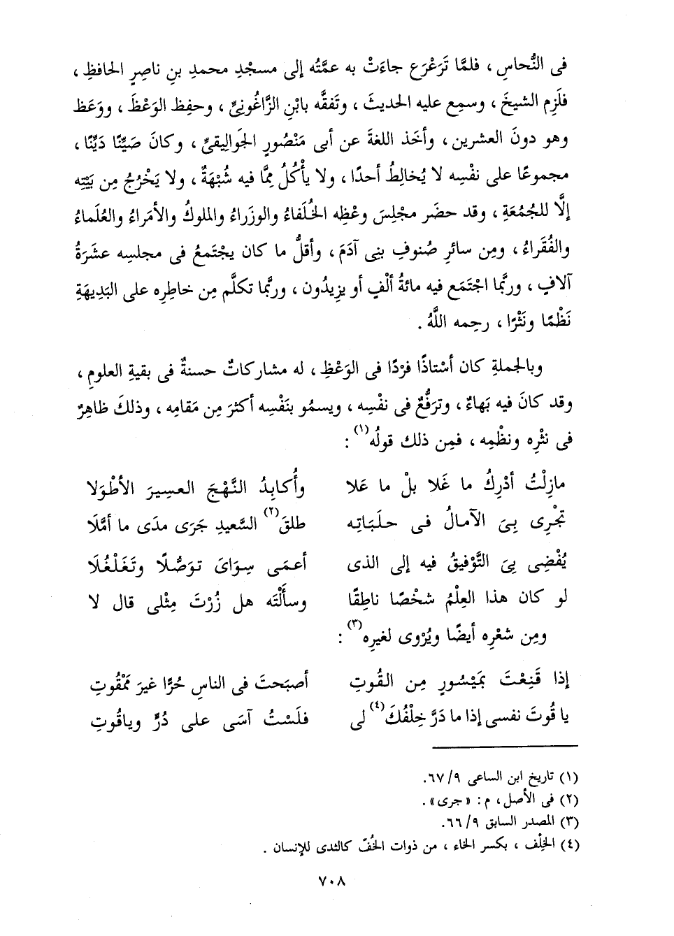 وَبِالْجُمْلَةِ كَانَ أُسْتَاذًا فَرْدًا فِي الْوَعْظِ، لَهُ مُشَارَكَاتٌ حَسَنَةٌ فِي بَقِيَّةِ الْعُلُومِ، وَقَدْ كَانَ فِيهِ بَهَاءٌ، وَتَرَفُّعٌ فِي نَفْسِهِ، وَيَسْمُو بِنَفْسِهِ أَكْثَرَ مِنْ مَقَامِهِ، وَذَلِكَ ظَاهِرٌ فِي نَثْرِهِ وَنَظْمِهِ، فَمِنْ ذَلِكَ قَوْلُهُ: