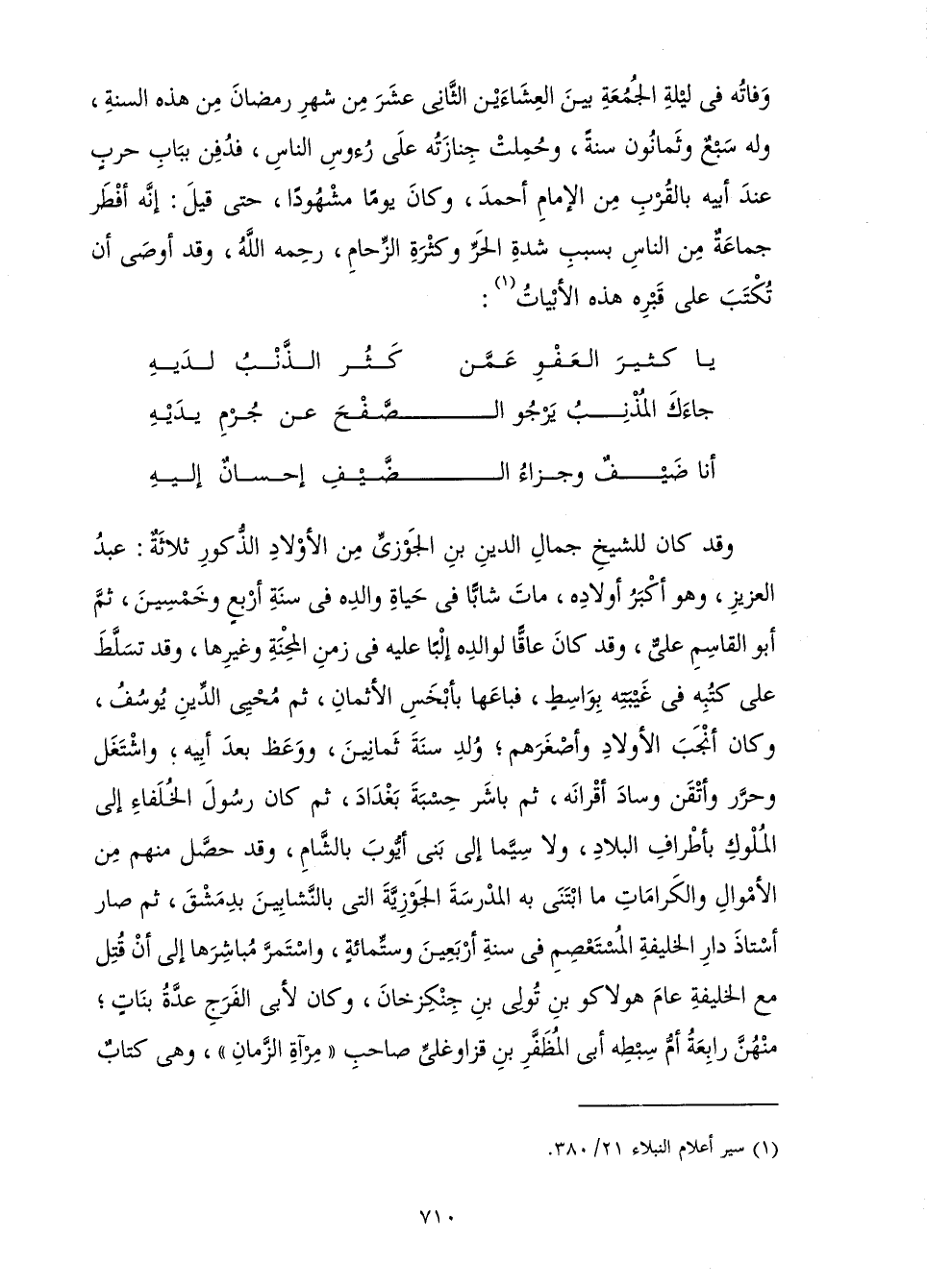وَفَاتُهُ فِي لَيْلَةِ الْجُمُعَةِ بَيْنَ الْعِشَاءَيْنِ الثَّانِي عَشَرَ مِنْ رَمَضَانَ مِنْ هَذِهِ السَّنَةِ، وَلَهُ سَبْعٌ وَثَمَانُونَ سَنَةً، وَحُمِلَتْ جِنَازَتُهُ عَلَى رُءُوسِ النَّاسِ، فَدُفِنَ بِبَابِ حَرْبٍ عِنْدَ أَبِيهِ بِالْقُرْبِ مِنَ الْإِمَامِ أَحْمَدَ، وَكَانَ يَوْمًا مَشْهُودًا، حَتَّى قِيلَ: إِنَّهُ أَفْطَرَ جَمَاعَةٌ مِنَ النَّاسِ بِسَبَبِ شِدَّةِ الْحَرِّ وَكَثْرَةِ الزِّحَامِ؛ رَحِمَهُ اللَّهُ، وَقَدْ أَوْصَى أَنْ تُكْتَبَ عَلَى قَبْرِهِ هَذِهِ الْأَبْيَاتُ: