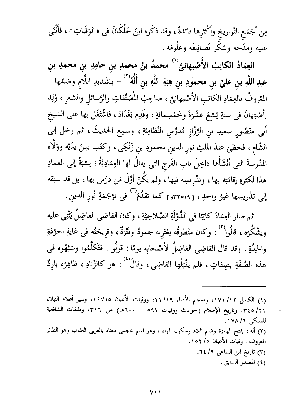 مُحَمَّدُ بْنُ مُحَمَّدِ بْنِ حَامِدِ بْنِ مُحَمَّدِ بْنِ عَبْدِ اللَّهِ بْنِ عَلِيِّ بْنِ مَحْمُودِ بْنِ هِبَةِ اللَّهِ بْنِ أَلُّهْ - بِتَشْدِيدِ اللَّامِ وَضَمِّهَا - الْمَعْرُوفُ بِالْعِمَادِ الْكَاتِبِ الْأَصْبَهَانِيِّ، صَاحِبُ الْمُصَنَّفَاتِ وَالرَّسَائِلِ وَالشِّعْرِ، وُلِدَ بِأَصْبَهَانَ فِي سَنَةِ تِسْعَ عَشْرَةَ وَخَمْسِمِائَةٍ، وِقَدِمَ بَغْدَادَ فَاشْتَغَلَ بِهَا عَلَى الشَّيْخِ أَبِي مَنْصُورٍ سَعِيدِ بْنِ الرَّزَّازِ مُدَرِّسِ النِّظَامِيَّةِ، وَسَمِعَ الْحَدِيثَ، ثُمَّ رَحَلَ إِلَى الشَّامِ فَحَظِيَ عِنْدَ الْمَلِكِ نُورِ الدِّينِ مَحْمُودِ بْنِ زَنْكِيٍّ، وَكَتَبَ بَيْنَ يَدَيْهِ وَوَلَّاهُ الْمَدْرَسَةَ الَّتِي أَنْشَأَهَا دَاخِلَ بَابِ الْفَرَجِ الَّتِي يُقَالُ لَهَا الْعِمَادِيَّةِ ; نِسْبَةً إِلَى الْعِمَادِ هَذَا لِكَثْرَةِ إِقَامَتِهِ بِهَا، وَتَدْرِيسِهِ فِيهَا، وَلَمْ يَكُنْ أَوَّلَ مَنْ دَرَّسَ بِهَا، بَلْ قَدْ سَبَقَهُ إِلَى تَدْرِيسِهَا غَيْرُ وَاحِدٍ، كَمَا تَقَدَّمَ فِي تَرْجَمَةِ نُورِ الدِّينِ.
