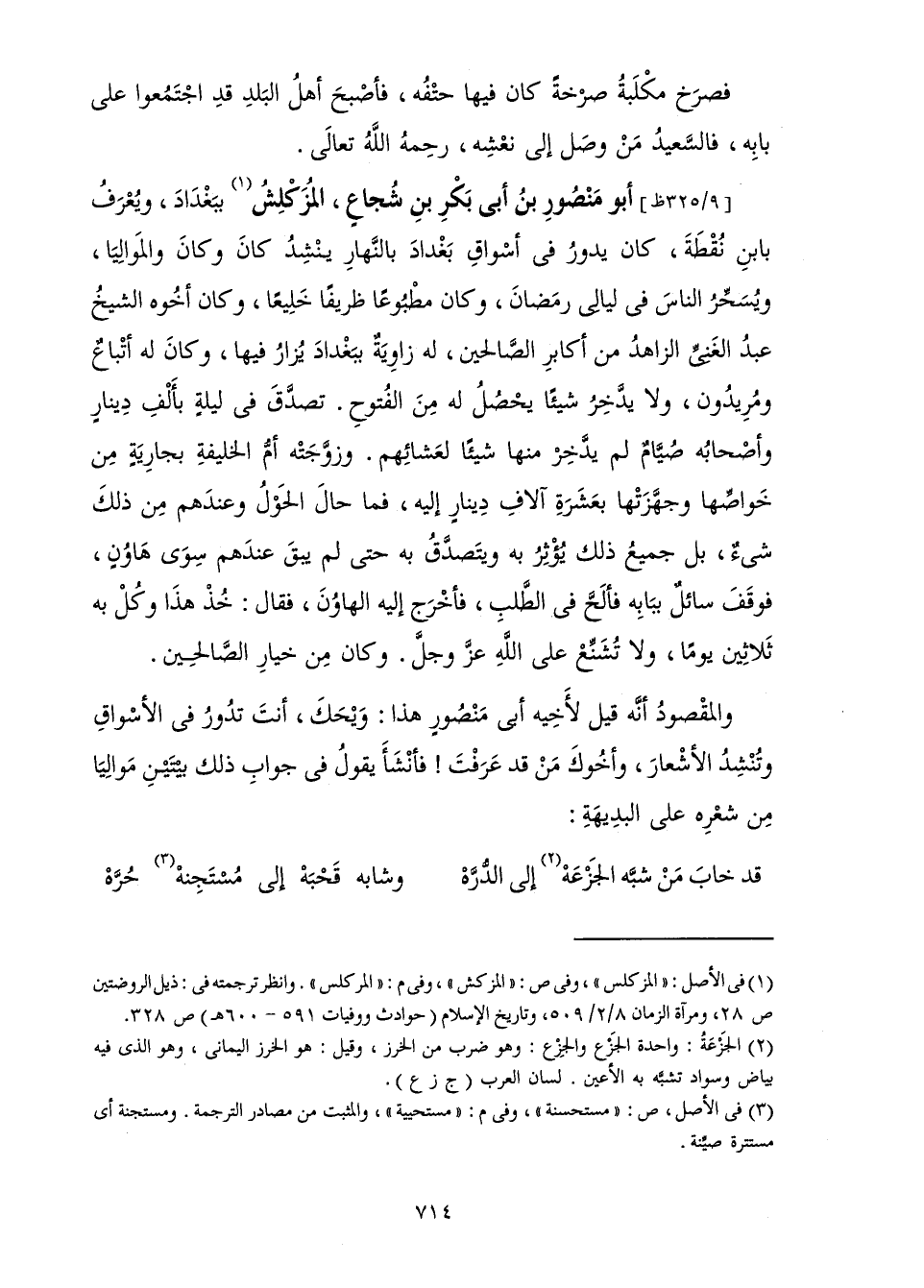 الْمُزَكْلِشُ بِبَغْدَادَ، وَيُعْرَفُ بِابْنِ نُقْطَةَ، كَانَ يَدُورُ فِي أَسْوَاقِ بَغْدَادَ بِالنَّهَارِ يُنْشِدُ كَانَ وَكَانَ وَالْمَوَالِيَا، وَيُسَحِّرُ النَّاسَ فِي لَيَالِي رَمَضَانَ، وَكَانَ مَطْبُوعًا ظَرِيفًا خَلِيعًا، وَكَانَ أَخُوهُ الشَّيْخُ عَبْدُ الْغَنِيِّ الزَّاهِدُ مِنْ أَكَابِرِ الصَّالِحِينَ، لَهُ زَاوِيَةٌ بِبَغْدَادَ يُزَارُ فِيهَا، وَكَانَ لَهُ أَتْبَاعٌ وَمُرِيدُونَ، وَلَا يَدَّخِرُ شَيْئًا يَحْصُلُ لَهُ مِنَ الْفُتُوحِ. تَصَدَّقَ فِي لَيْلَةٍ بِأَلْفِ دِينَارٍ وَأَصْحَابُهُ صُيَّامٌ لَمْ يَدَّخِرْ مِنْهَا شَيْئًا لِعَشَائِهِمْ. وَزَوْجَتُهُ أَمُّ الْخَلِيفَةِ بِجَارِيَةٍ مِنْ خَوَاصِّهَا وَجَهَّزَتْهَا بِعَشَرَةِ آلَافِ دِينَارٍ إِلَيْهِ، فَمَا حَالَ الْحَوْلُ وَعِنْدَهُمْ مِنْ ذَلِكَ شَيْءٌ، بَلْ جَمِيعُ ذَلِكَ يُؤْثِرُ بِهِ وَيَتَصَدَّقُ بِهِ حَتَّى لَمْ يَبْقَ عِنْدَهُمْ سِوَى هَاوُنٍ، فَوَقَفَ سَائِلٌ بِبَابِهِ فَأَلَحَ فِي الطَّلَبِ، فَأَخْرَجَ إِلَيْهِ الْهَاوُنَ، فَقَالَ: خُذْ هَذَا وَكُلْ بِهِ ثَلَاثِينَ يَوْمًا، وَلَا تُشَنِّعْ عَلَى اللَّهِ عَزَّ وَجَلَّ، وَكَانَ مِنْ خِيَارِ الصَّالِحِينَ.