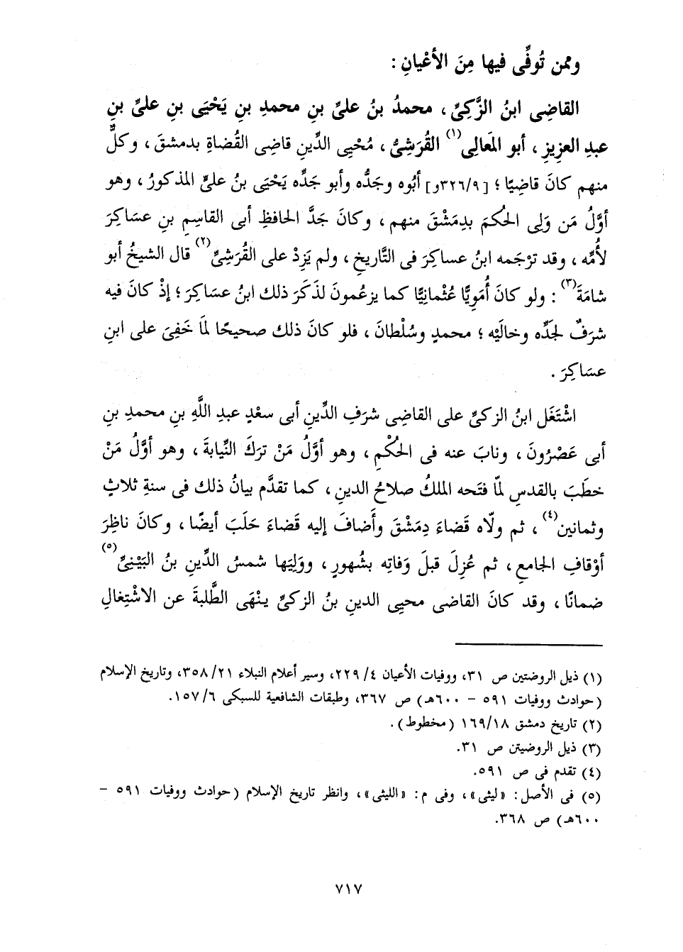 مُحَمَّدُ بْنُ عَلِيِّ بْنِ مُحَمَّدِ بْنِ يَحْيَى بْنِ عَلِيِّ بْنِ عَبْدِ الْعَزِيزِ أَبُو الْمَعَالِي الْقُرَشِيُّ، مُحْيِي الدِّينِ قَاضِي الْقُضَاةِ بِدِمَشْقَ، وَكُلٌّ مِنْهُمْ كَانَ قَاضِيًا ; أَبُوهُ وَجَدُّهُ وَأَبُو جَدِّهِ يَحْيَى بْنُ عَلِيٍّ الْمَذْكُورُ، وَهُوَ أَوَّلُ مَنْ وَلِيَ الْحُكْمَ بِدِمَشْقَ مِنْهُمْ، وَكَانَ جَدَّ الْحَافِظِ أَبِي الْقَاسِمِ بْنِ عَسَاكِرَ لِأُمِّهِ، وَقَدْ تَرْجَمَهُ ابْنُ عَسَاكِرَ فِي التَّارِيخِ، وَلَمْ يَزِدْ عَلَى الْقُرَشِيِّ، قَالَ الشَّيْخُ أَبُو شَامَةَ: وَلَوْ كَانَ أُمَوِيًّا عُثْمَانِيًّا كَمَا يَزْعُمُونَ لَذَكَرَ ذَلِكَ ابْنُ عَسَاكِرَ، إِذْ كَانَ فِيهِ شَرَفٌ لِجَدِّهِ وَخَالَيْهِ، مُحَمَّدٍ وَسُلْطَانَ فَلَوْ كَانَ ذَلِكَ صَحِيحًا لَمَا خُفِيَ عَلَى ابْنِ عَسَاكِرَ.