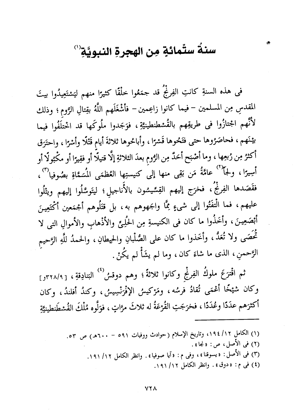 فِي هَذِهِ السَّنَةِ كَانَتِ الْفِرِنْجُ قَدْ جَمَعُوا خَلْقًا كَثِيرًا مِنْهُمْ لِيَسْتَعِيدُوا بَيْتَ الْمَقْدِسِ مِنَ الْمُسْلِمِينَ - فِيمَا كَانُوا زَاعِمِينَ - فَأَشْغَلَهُمُ اللَّهُ بِقِتَالِ الرُّومِ ; وَذَلِكَ لِأَنَّهُمُ اجْتَازُوا فِي طَرِيقِهِمْ بِالْقُسْطَنْطِينِيَّةِ، فَوَجَدُوا مُلُوكَهَا قَدِ اخْتَلَفُوا فِيمَا بَيْنَهُمْ، فَحَاصَرُوهَا حَتَّى فَتَحُوهَا قَسْرًا، وَأَبَاحُوهَا ثَلَاثَةَ أَيَّامٍ قَتْلًا وَأَسْرًا، وَاحْتَرَقَ أَكْثَرُ مِنْ رُبْعِهَا، وَمَا أَصْبَحَ أَحَدٌ مِنَ الرُّومِ بَعْدَ الثَّلَاثَةِ إِلَّا قَتِيلًا أَوْ فَقِيرًا أَوْ مَكْبُولًا أَوْ أَسِيرًا، وَلَجَأَ عَامَّةُ مَنْ بَقِيَ مِنْهَا إِلَى كَنِيسَتِهَا الْعُظْمَى الْمُسَمَّاةِ بِصُوفِيَا، فَقَصَدَهَا الْفِرِنْجُ، فَخَرَجَ إِلَيْهِمُ الْقِسِّيسُونَ بِالْأَنَاجِيلِ ; لِيَتَوَسَّلُوا إِلَيْهِمْ وَيَتْلُوا عَلَيْهِمْ، فَمَا الْتَفَتُوا إِلَى شَيْءٍ مِمَّا وَاجَهُوهُمْ بِهِ، بَلْ قَتَلُوهُمْ أَجْمَعِينَ أَكْتَعِينَ أَبْصَعِينَ، وَأَخَذُوا مَا كَانَ فِي الْكَنِيسَةِ مِنَ الْحُلِيِّ وَالْأَذْهَابِ وَالْأَمْوَالِ الَّتِي لَا تُحْصَى وَلَا تُعَدُّ، وَأَخَذُوا مَا كَانَ عَلَى الصُّلْبَانِ وَالْحِيطَانِ؛ وَالْحَمْدُ لِلَّهِ الرَّحِيمِ الرَّحْمَنِ، الَّذِي مَا شَاءَ كَانَ، وَمَا لَمْ يَشَأْ لَمْ يَكُنْ.