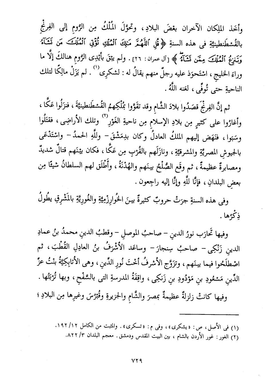 وَأَخَذَ الْمَلِكَانِ الْآخَرَانِ بَعْضَ الْبِلَادِ، وَتَحَوَّلَ الْمُلْكُ مِنَ الرُّومِ إِلَى الْفِرِنْجِ بِالْقُسْطَنْطِينِيَّةِ فِي هَذِهِ السَّنَةِ {قُلِ اللَّهُمَّ مَالِكَ الْمُلْكِ تُؤْتِي الْمُلْكَ مَنْ تَشَاءُ وَتَنْزِعُ الْمُلْكَ مِمَّنْ تَشَاءُ} [آل عمران: 26] وَلَمْ يَبْقَ بِأَيْدِي الرُّومِ هُنَاكَ إِلَّا مَا وَرَاءَ الْخَلِيجِ، اسْتَحْوَذَ عَلَيْهِ رَجُلٌ مِنَ الرُّومِ يُقَالُ لَهُ: لَشْكُرِي. لَمْ يَزَلْ مَالِكًا لِتِلْكَ النَّاحِيَةِ حَتَّى تُوُفِّيَ؛ لَعَنَهُ اللَّهُ.