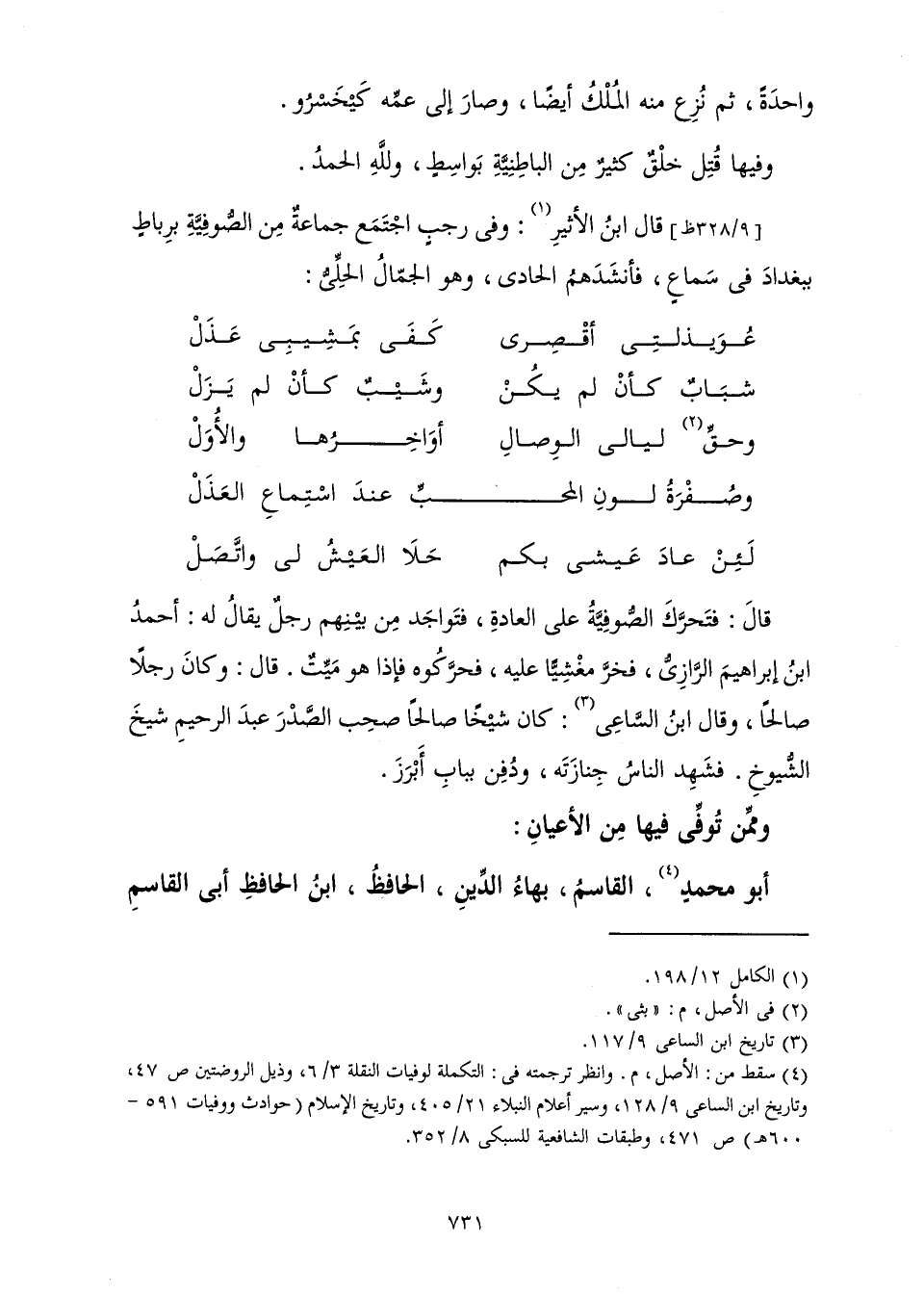 قَالَ ابْنُ الْأَثِيرِ: وَفِي رَجَبٍ اجْتَمَعَ جَمَاعَةٌ مِنَ الصُّوفِيَّةِ بِرِبَاطٍ بِبَغْدَادَ فِي سَمَاعٍ، فَأَنْشَدَهُمُ الْحَادِي، وَهُوَ الْجَمَّالُ الْحِلِّيُّ: