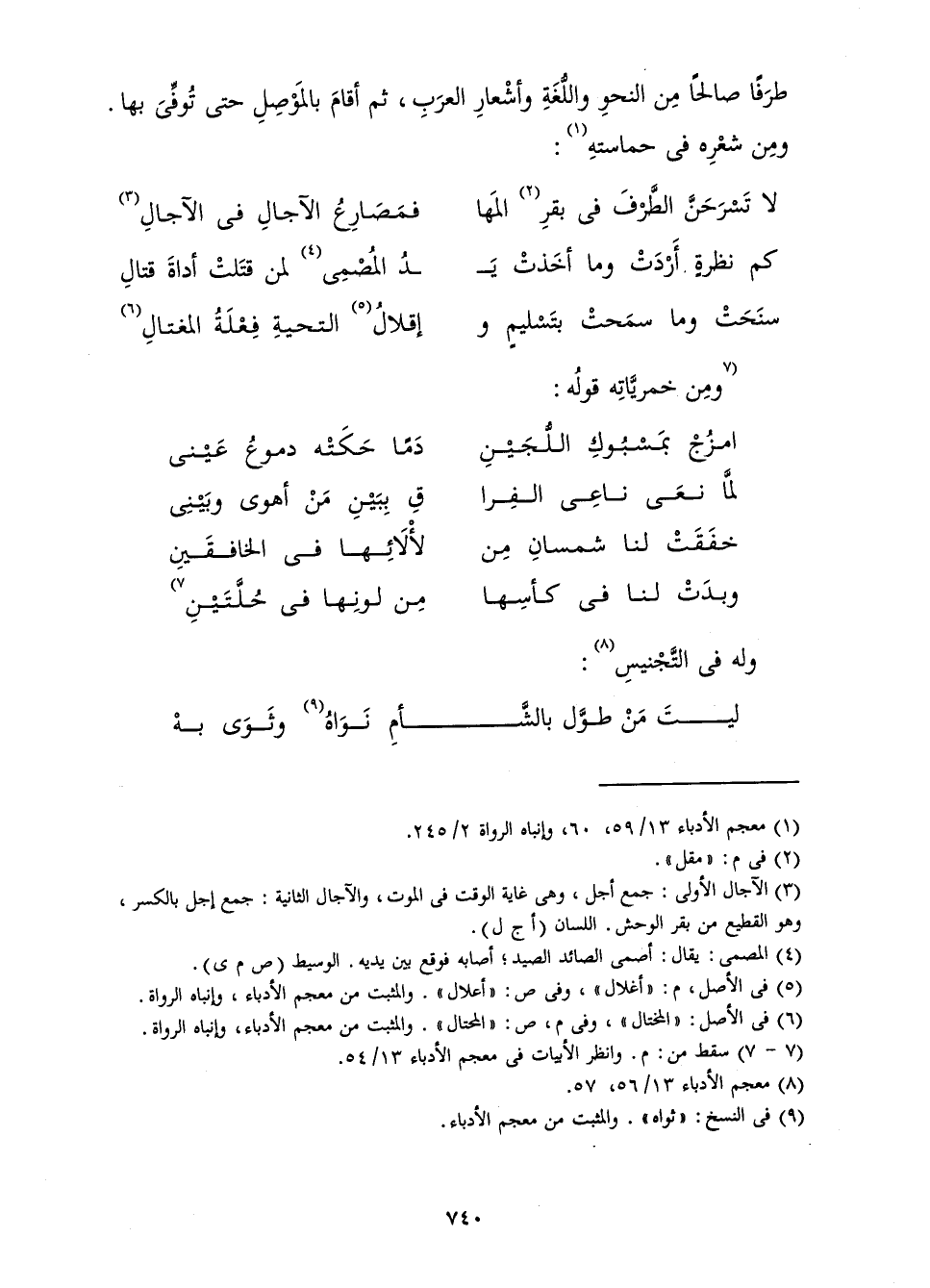 طَرَفًا صَالِحًا مِنَ النَّحْوِ وَاللُّغَةِ وَأَشْعَارِ الْعَرَبِ، ثُمَّ أَقَامَ بِالْمَوْصِلِ حَتَّى تُوفِّيَ بِهَا. وَمِنْ شِعْرِهِ فِي حَمَاسَتِهِ: