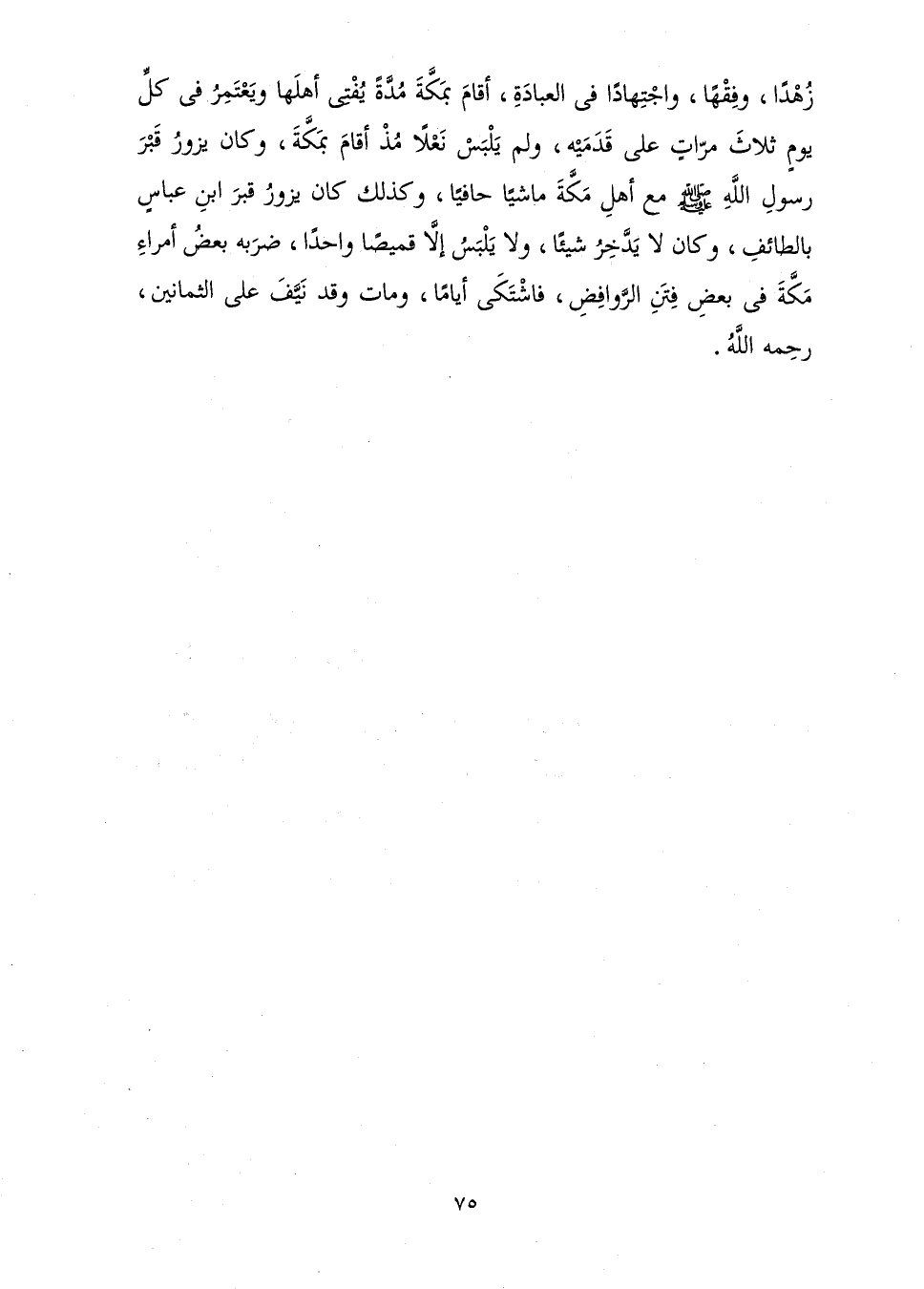 زُهْدًا وَفِقْهًا وَاجْتِهَادًا فِي الْعِبَادَةِ، أَقَامَ بِمَكَّةَ مُدَّةً يُفْتِي أَهْلَهَا وَيَعْتَمِرُ فِي كُلِّ يَوْمٍ ثَلَاثَ مَرَّاتٍ عَلَى قَدَمَيْهِ، وَلَمْ يَلْبَسْ نَعْلًا مُذْ أَقَامَ بِمَكَّةَ، وَكَانَ يَزُورُ قَبْرَ رَسُولِ اللَّهِ صَلَّى اللَّهُ عَلَيْهِ وَسَلَّمَ مَعَ أَهْلِ مَكَّةَ مَاشِيًا حَافِيًا، وَكَذَلِكَ كَانَ يَزُورُ قَبْرَ ابْنِ عَبَّاسٍ بِالطَّائِفِ، وَكَانَ لَا يَدَّخِرُ شَيْئًا وَلَا يَلْبَسُ إِلَّا قَمِيصًا وَاحِدًا، ضَرَبَهُ بَعْضُ أُمَرَاءِ مَكَّةَ فِي بَعْضِ فِتَنِ الرَّوَافِضِ فَاشْتَكَى أَيَّامًا، وَمَاتَ وَقَدْ نَيَّفَ عَلَى الثَّمَانِينَ. رَحِمَهُ اللَّهُ.