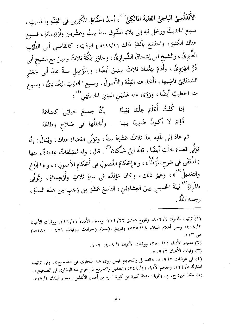 الْأَنْدَلُسِيُّ الْبَاجِيُّ الْفَقِيهُ الْمَالِكِيُّ أَحَدُ الْحُفَّاظِ الْمُكْثِرِينَ فِي الْفِقْهِ وَالْحَدِيثِ، سَمِعَ الْحَدِيثَ، وَرَحَلَ فِيهِ إِلَى بِلَادِ الْمَشْرِقِ سَنَةَ سِتٍّ وَعِشْرِينَ وَأَرْبَعِمِائَةٍ، فَسَمِعَ هُنَاكَ الْكَثِيرَ، وَاجْتَمَعَ بِأَئِمَّةِ ذَلِكَ الْوَقْتِ كَالْقَاضِي أَبِي الطِّيِّبِ الطَّبَرِيِّ وَأَبِي إِسْحَاقَ الشِّيرَازِيِّ، وَجَاوَرَ بِمَكَّةَ ثَلَاثَ سِنِينَ مَعَ الشَّيْخِ أَبِي ذَرٍّ الْهَرَوِيِّ، وَأَقَامَ بِبَغْدَادَ ثَلَاثَ سِنِينَ أَيْضًا وَبِالْمَوْصِلِ سَنَةً عِنْدَ أَبِي جَعْفَرٍ السِّمْنَانِيُّ قَاضِيهَا فَأَخَذَ عَنْهُ الْفِقْهَ وَالْأُصُولَ وَسَمِعَ الْخَطِيبَ الْبَغْدَادِيَّ وَسَمِعَ مِنْهُ الْخَطِيبُ أَيْضًا وَرَوَى عَنْهُ هَذَيْنِ الْبَيْتَيْنِ الْحَسَنَيْنِ: