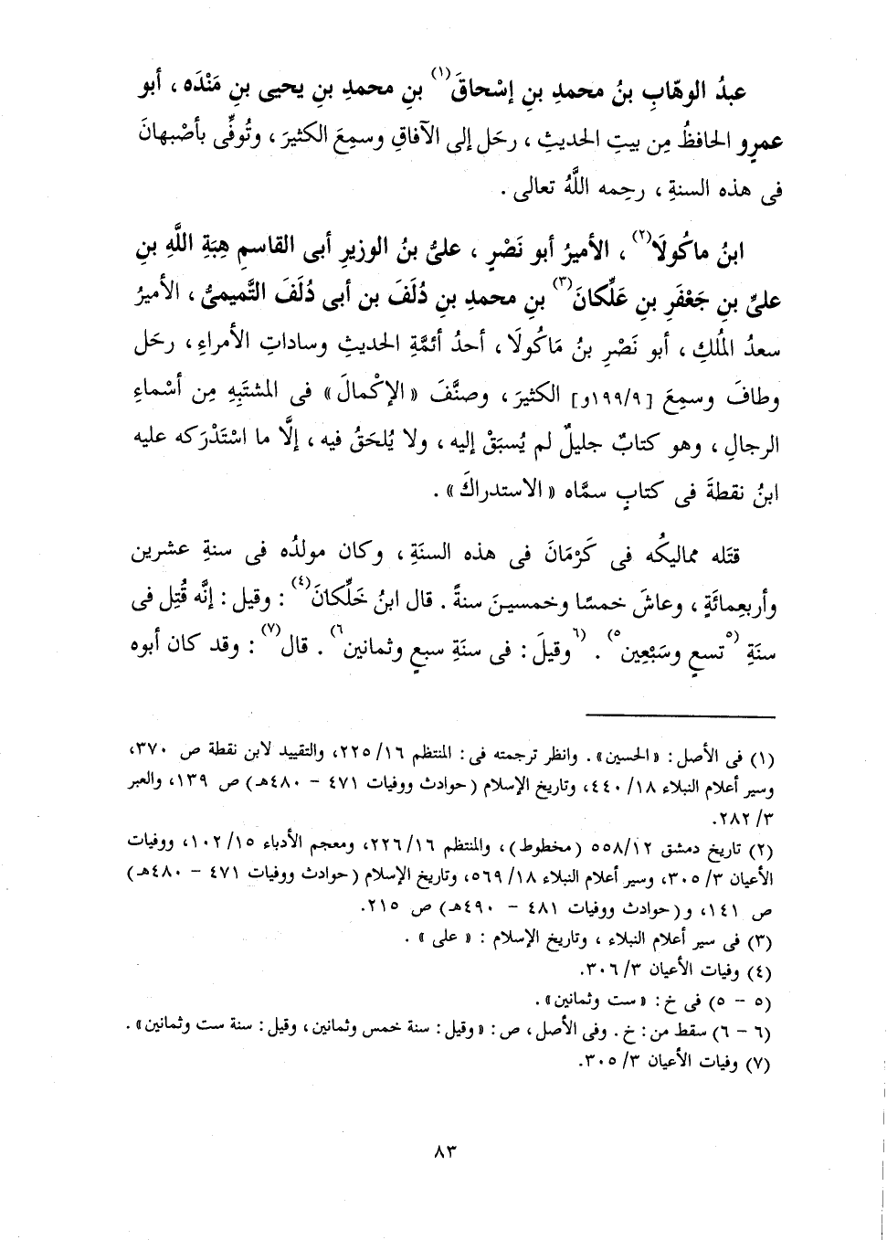 ابْنُ مَاكُولَا الْأَمِيرُ أَبُو نَصْرٍ، عَلِيُّ بْنُ الْوَزِيرِ أَبِي الْقَاسِمِ هِبَةِ اللَّهِ بْنِ عَلِيِّ بْنِ جَعْفَرِ بْنِ عَلِّكَانَ بْنِ مُحَمَّدِ بْنِ دُلَفَ بْنِ أَبِي دُلَفَ التَّمِيمِيُّ، الْأَمِيرُ سَعْدُ الْمُلْكِ، أَبُو نَصْرِ بْنُ مَاكُولَا، أَحَدُ أَئِمَّةِ الْحَدِيثِ وَسَادَاتِ الْأُمَرَاءِ، رَحَلَ وَطَافَ وَسَمِعَ الْكَثِيرَ وَصَنَّفَ " الْإِكْمَالَ " فِي الْمُشْتَبَهِ مِنْ أَسْمَاءِ الرِّجَالِ وَهُوَ كِتَابٌ جَلِيلٌ لَمْ يُسْبَقْ إِلَيْهِ وَلَا يُلْحَقُ فِيهِ، إِلَّا مَا اسْتَدْرَكَهُ عَلَيْهِ ابْنُ نُقْطَةَ فِي كِتَابٍ سَمَّاهُ " الِاسْتِدْرَاكَ "،