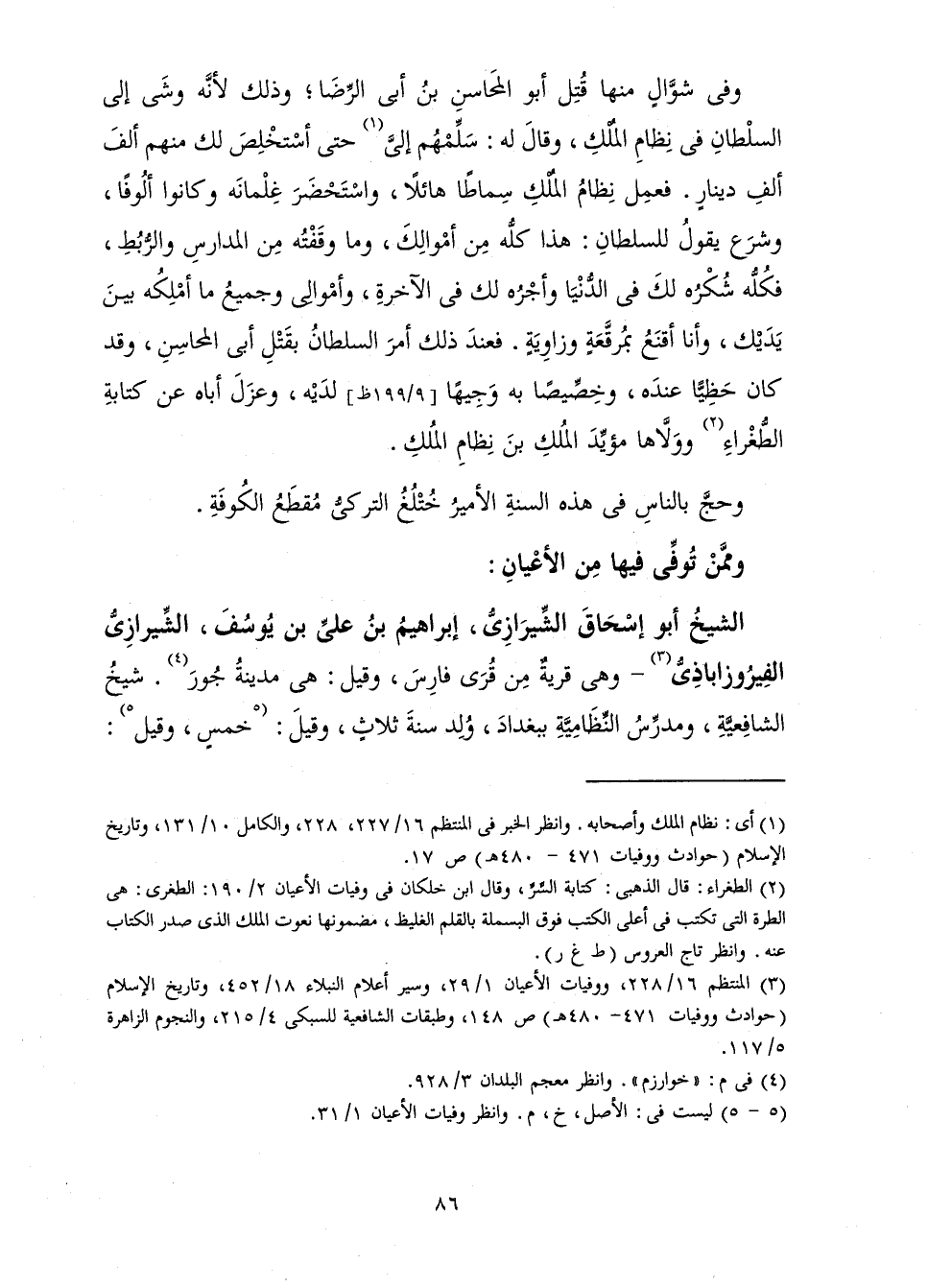 الشَّيْخُ أَبُو إِسْحَاقَ الشِّيرَازِيُّ إِبْرَاهِيمُ بْنُ عَلِيِّ بْنِ يُوسُفَ الْفِيرُوزَابَاذِيُّ - وَهِيَ قَرْيَةٌ مِنْ قُرَى فَارِسَ وَقِيلَ: هِيَ مَدِينَةُ جُورَ - شَيْخُ الشَّافِعِيَّةِ وَمُدَرِّسُ النِّظَامِيَّةِ بِبَغْدَادَ وُلِدَ سَنَةَ ثَلَاثٍ وَقِيلَ: خَمْسٍ وَقِيلَ: