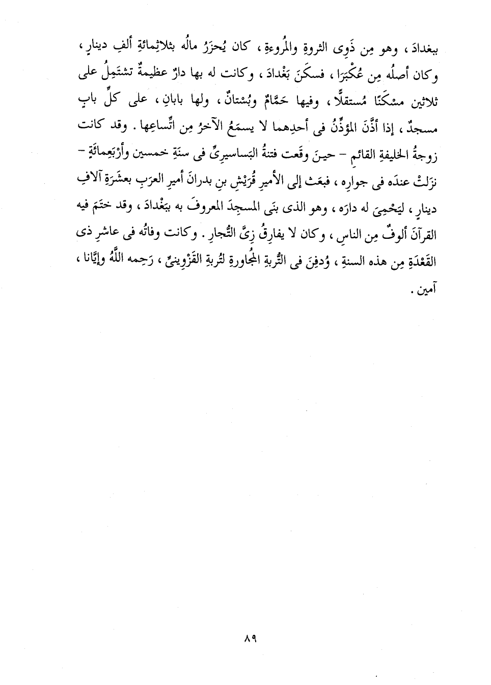 بِبَغْدَادَ وَهُوَ مِنْ ذَوِي الثَّرْوَةِ وَالْمُرُوءَةِ كَانَ يُحْزَرُ مَالُهُ بِثَلَاثِمِائَةِ أَلْفِ دِينَارٍ وَكَانَ أَصْلُهُ مِنْ عُكْبَرَا فَسَكَنَ بَغْدَادَ وَكَانَتْ لَهُ بِهَا دَارٌ عَظِيمَةٌ تَشْتَمِلُ عَلَى ثَلَاثِينَ مَسْكَنًا مُسْتَقِلًّا وَفِيهَا حَمَّامٌ وَبُسْتَانٌ وَلَهَا بَابَانِ عَلَى كُلِّ بَابٍ مَسْجِدٌ إِذَا أَذَّنَ الْمُؤَذِّنُ فِي أَحَدِهِمَا لَا يُسْمَعُ الْآخَرُ مِنِ اتِّسَاعِهَا. وَقَدْ كَانَتْ زَوْجَةُ الْخَلِيفَةِ الْقَائِمِ - حِينَ وَقَعَتْ فِتْنَةُ الْبَسَاسِيرِيِّ فِي سَنَةِ خَمْسِينَ وَأَرْبَعِمِائَةٍ - نَزَلَتْ عِنْدَهُ فِي جِوَارِهِ، فَبَعَثَ إِلَى الْأَمِيرِ قُرَيْشِ بْنِ بَدْرَانَ أَمِيرِ الْعَرَبِ بِعَشَرَةِ آلَافِ دِينَارٍ لِيَحْمِيَ لَهُ دَارَهُ وَهُوَ الَّذِي بَنَى الْمَسْجِدَ الْمَعْرُوفَ بِهِ بِبَغْدَادَ وَقَدْ خَتَمَ فِيهِ الْقُرْآنَ أُلُوفٌ مِنَ النَّاسِ وَكَانَ لَا يُفَارِقُ زِيَّ التُّجَّارِ. وَكَانَتْ وَفَاتُهُ فِي عَاشِرِ ذِي الْقَعْدَةِ مِنْ هَذِهِ السَّنَةِ، وَدُفِنَ فِي التُّرْبَةِ الْمُجَاوِرَةِ لِتُرْبَةِ الْقَزْوِينِيِّ رَحِمَهُ اللَّهُ وَإِيَّانَا، آمِينَ.