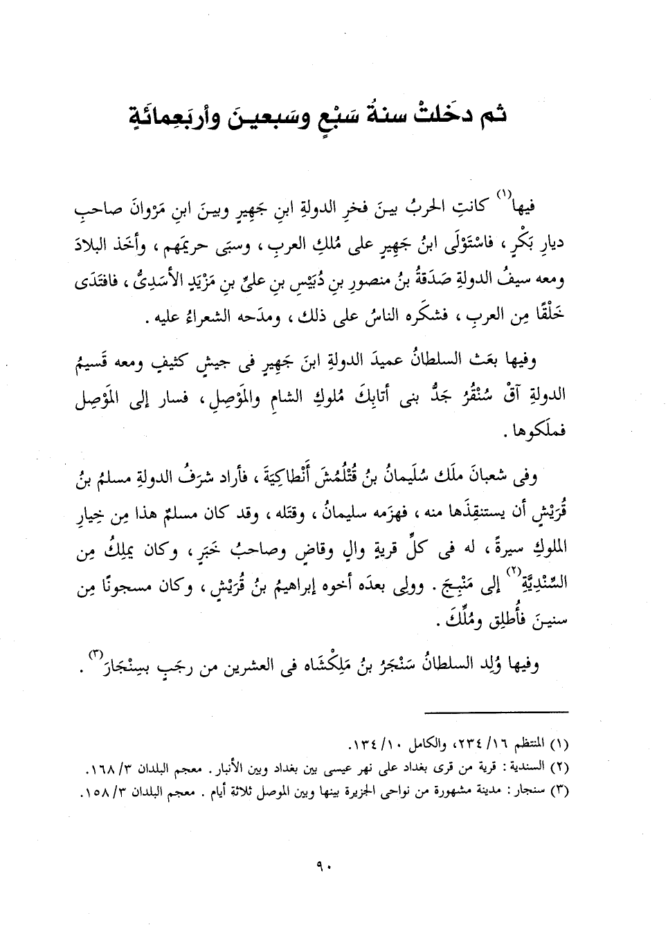 فِيهَا كَانَتِ الْحَرْبُ بَيْنَ فَخْرِ الدَّوْلَةِ ابْنِ جَهِيرٍ وَبَيْنَ ابْنِ مَرْوَانَ صَاحِبِ دِيَارِ بِكْرٍ فَاسْتَوْلَى ابْنُ جَهِيرٍ عَلَى مُلْكِ الْعَرَبِ وَسَبَى حَرِيمَهُمْ وَأَخَذَ الْبِلَادَ وَمَعَهُ سَيْفُ الدَّوْلَةِ صَدَقَةُ بْنُ مَنْصُورِ بْنِ دُبَيْسِ بْنِ عَلِيِّ بْنِ مَزْيَدٍ الْأَسَدِيُّ، فَافْتَدَى خَلْقًا مِنَ الْعَرَبِ فَشَكَرَهُ النَّاسُ عَلَى ذَلِكَ وَمَدَحَهُ الشُّعَرَاءُ عَلَيْهِ.