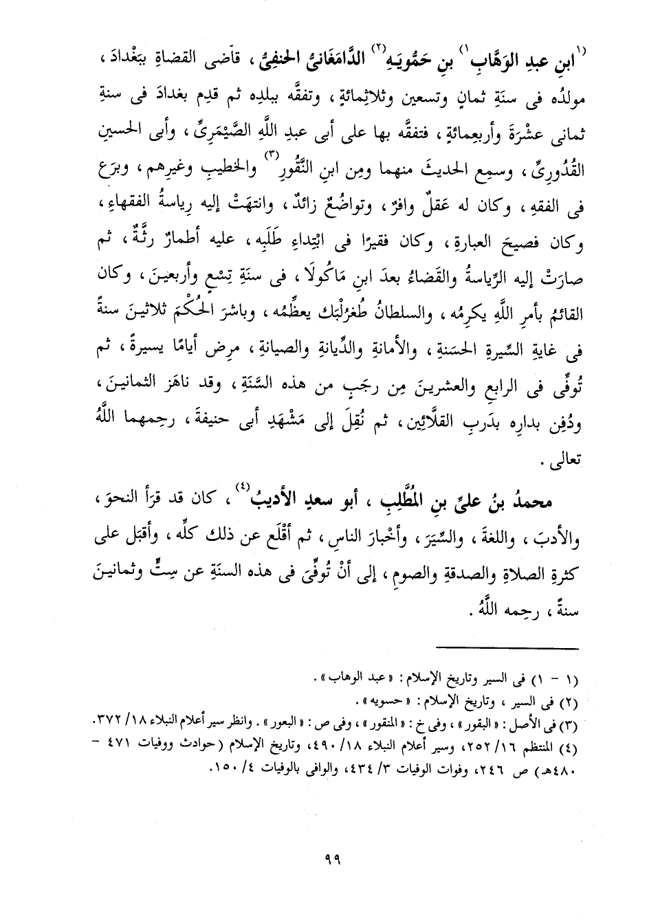 بْنِ عَبْدِ الْوَهَّابِ بْنِ حَمُّوَيَهِ الدَّامَغَانِيُّ الْحَنَفِيُّ، قَاضِي الْقُضَاةِ بِبَغْدَادَ، مَوْلِدُهُ فِي سِنَةِ ثَمَانٍ وَتِسْعِينَ وَثَلَاثِمِائَةٍ وَتَفَقَّهَ بِبَلَدِهِ ثُمَّ قَدِمَ بَغْدَادَ فِي سَنَةِ ثَمَانِيَ عَشْرَةَ وَأَرْبَعِمِائَةٍ فَتَفَقَّهَ بِهَا عَلَى أَبِي عَبْدِ اللَّهِ الصَّيْمَرِيِّ وَأَبِي الْحُسَيْنِ الْقُدُورِيِّ وَسَمِعَ الْحَدِيثَ مِنْهُمَا وَمِنِ ابْنِ النَّقُورِ وَالْخَطِيبِ وَغَيْرِهِمْ، وَبَرَعَ فِي الْفِقْهِ وَكَانَ لَهُ عَقْلٌ وَافِرٌ وَتَوَاضُعٌ زَائِدٌ، وَانْتَهَتْ إِلَيْهِ رِيَاسَةُ الْفُقَهَاءِ، وَكَانَ فَصِيحَ الْعِبَارَةِ، وَكَانَ فَقِيرًا فِي ابْتِدَاءِ طَلَبِهِ، عَلَيْهِ أَطْمَارٌ رَثَّةٌ ثُمَّ صَارَتْ إِلَيْهِ الرِّيَاسَةُ وَالْقَضَاءُ بَعْدَ ابْنِ مَاكُولَا فِي سَنَةِ تِسْعٍ وَأَرْبَعِينَ، وَكَانَ الْقَائِمُ بِأَمْرِ اللَّهِ يُكْرِمُهُ وَالسُّلْطَانُ طُغْرُلْبَكُ يُعَظِّمُهُ وَبَاشَرَ الْحُكْمَ ثَلَاثِينَ سَنَةً فِي غَايَةِ السِّيرَةِ الْحَسَنَةِ وَالْأَمَانَةِ وَالدِّيَانَةِ وَالصِّيَانَةِ، مَرِضَ أَيَّامًا يَسِيرَةً ثُمَّ تُوُفِّيَ فِي الرَّابِعِ وَالْعِشْرِينَ مِنْ رَجَبٍ مِنْ هَذِهِ السَّنَةِ وَقَدْ نَاهَزَ الثَّمَانِينَ وَدُفِنَ بِدَارِهِ بِدَرْبِ الْقَلَّائِينَ ثُمَّ نُقِلَ إِلَى مَشْهَدِ أَبِي حَنِيفَةَ، رَحِمَهُمَا اللَّهُ تَعَالَى.