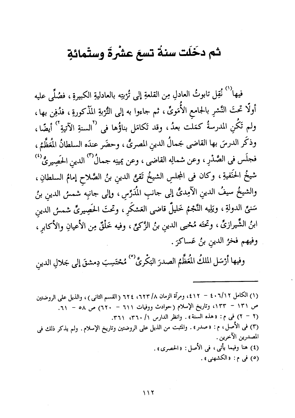 فِيهَا نُقِلَ تَابُوتُ الْعَادِلِ مِنَ الْقَلْعَةِ إِلَى تُرْبَتِهِ بِالْعَادِلِيَّةِ الْكَبِيرَةِ، فَصُلِّيَ عَلَيْهِ أَوَّلًا تَحْتَ النَّسْرِ بِالْجَامِعِ الْأُمَوِيِّ، ثُمَّ جَاءُوا بِهِ إِلَى التُّرْبَةِ الْمَذْكُورَةِ، فَدُفِنَ بِهَا، وَلَمْ تَكُنِ الْمَدْرَسَةُ كَمَلَتْ بَعْدُ، وَقَدْ تَكَامَلَ بِنَاؤُهَا فِي السَّنَةِ الْآتِيَةِ أَيْضًا، وَذَكَرَ الدَّرْسَ بِهَا الْقَاضِي جَمَالُ الدِّينِ الْمِصْرِيُّ، وَحَضَرَ عِنْدَهُ السُّلْطَانُ الْمُعَظَّمُ، فَجَلَسَ فِي الصَّدْرِ، وَعَنْ شِمَالِهِ الْقَاضِي، وَعَنْ يَمِينِهِ جَمَالُ الدِّينِ الْحَصِيرِيُّ شَيْخُ الْحَنَفِيَّةِ، وَكَانَ فِي الْمَجْلِسِ الشَّيْخُ تَقِيُّ الدِّينِ بْنُ الصَّلَاحِ إِمَامُ السُّلْطَانِ، وَالشَّيْخُ سَيْفُ الدِّينِ الْآمِدِيُّ إِلَى جَانِبِ الْمُدَرِّسِ، وَإِلَى جَانِبِهِ شَمْسُ الدِّينِ بْنُ سَنِيِّ الدَّوْلَةِ، وَيَلِيهِ النَّجْمُ خَلِيلٌ قَاضِي الْعَسْكَرِ، وَتَحْتَ الْحَصِيرِيِّ شَمْسُ الدِّينِ بْنُ الشِّيرَازِيِّ، وَتَحْتَهُ مُحْيِي الدِّينِ بْنُ الزَّكِيِّ، وَفِيهِ خَلْقٌ مِنَ الْأَعْيَانِ وَالْأَكَابِرِ، وَفِيهِمْ فَخْرُ الدِّينِ بْنُ عَسَاكِرَ.