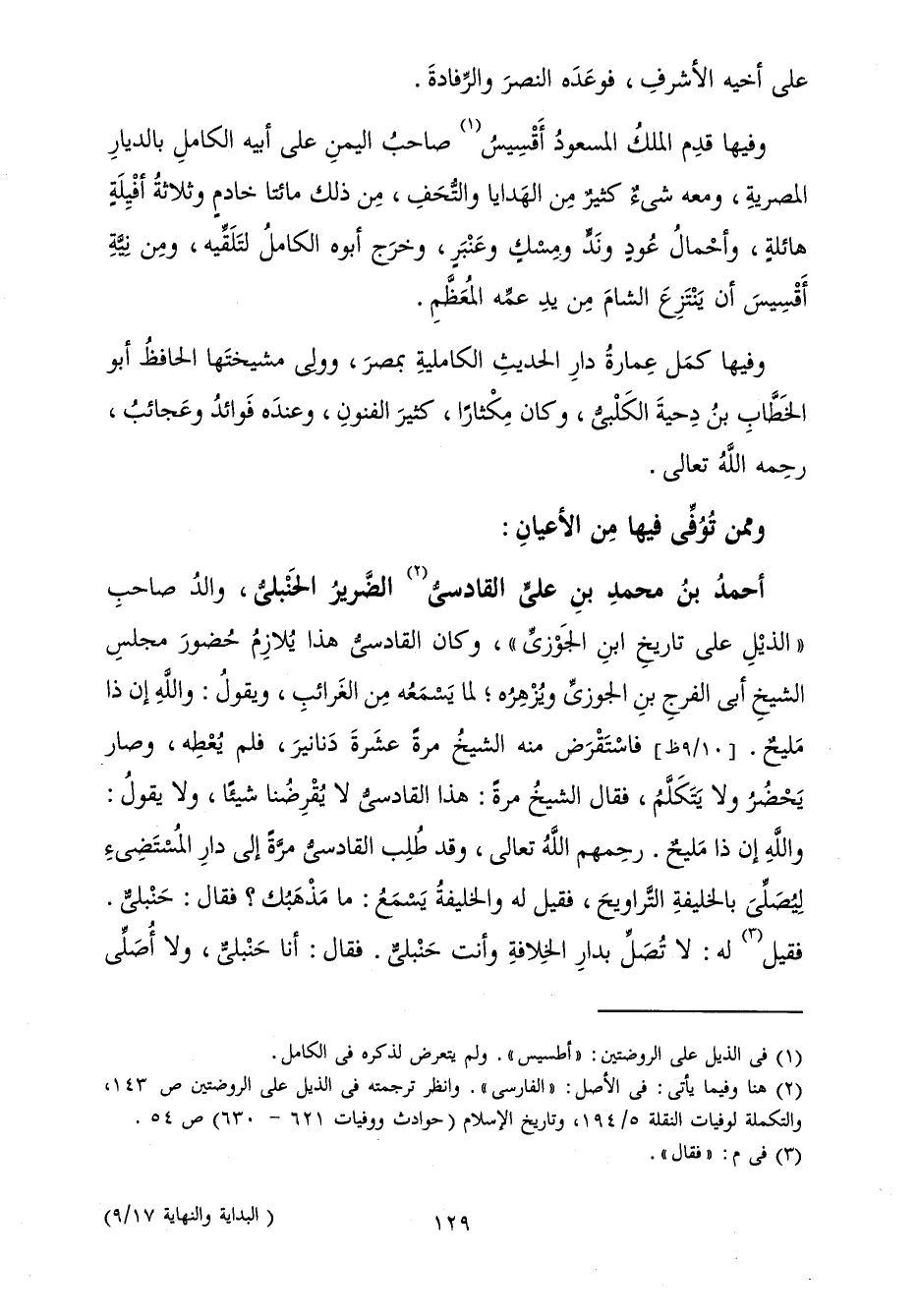 وَالِدُ صَاحِبِ " الذَّيْلِ عَلَى تَارِيخِ ابْنِ الْجَوْزِيِّ "، الْقَادِسِيُّ هَذَا يُلَازِمُ حُضُورَ مَجْلِسِ الشَّيْخِ أَبِي الْفَرَجِ بْنِ الْجَوْزِيِّ وَيُزْهِرُهُ; لِمَا يَسْمَعُهُ مِنَ الْغَرَائِبِ، وَيَقُولُ: وَاللَّهِ إِنَّ ذَا مَلِيحٌ، فَاسْتَقْرَضَ مِنْهُ الشَّيْخُ مَرَّةً عَشَرَةَ دَنَانِيرَ، فَلَمْ يُعْطِهِ، وَصَارَ يَحْضُرُ وَلَا يَتَكَلَّمُ، فَقَالَ الشَّيْخُ مَرَّةً: هَذَا الْقَادِسِيُّ لَا يُقْرِضُنَا شَيْئًا، وَلَا يَقُولُ: وَاللَّهِ إِنَّ ذَا مَلِيحٌ. رَحِمَهُمُ اللَّهُ تَعَالَى.