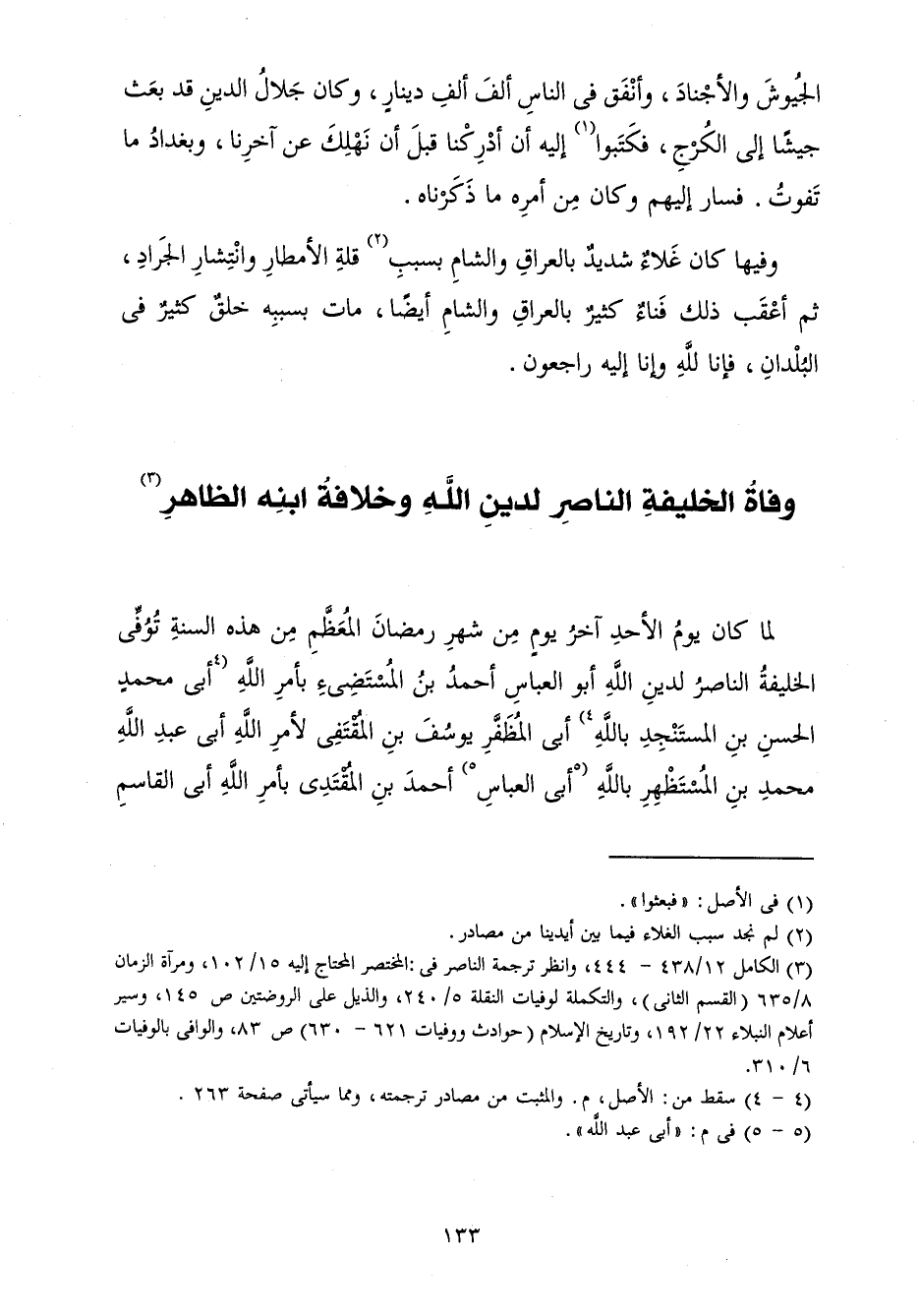 لَمَّا كَانَ يَوْمُ الْأَحَدِ آخِرَ يَوْمٍ مِنْ شَهْرِ رَمَضَانَ الْمُعَظَّمِ مِنْ هَذِهِ السَّنَةِ تُوُفِّيَ الْخَلِيفَةُ النَّاصِرُ لِدِينِ اللَّهِ أَبُو الْعَبَّاسِ أَحْمَدُ بْنُ الْمُسْتَضِيءِ بِأَمْرِ اللَّهِ أَبِي الْمُظَفَّرِ يُوسُفَ بْنِ الْمُقْتَفِي لِأَمْرِ اللَّهِ أَبِي عَبْدِ اللَّهِ مُحَمَّدِ بْنِ الْمُسْتَظْهِرِ بِاللَّهِ أَبِي الْعَبَّاسِ أَحْمَدَ بْنِ الْمُقْتَدِي بِأَمْرِ اللَّهِ أَبِي الْقَاسِمِ
