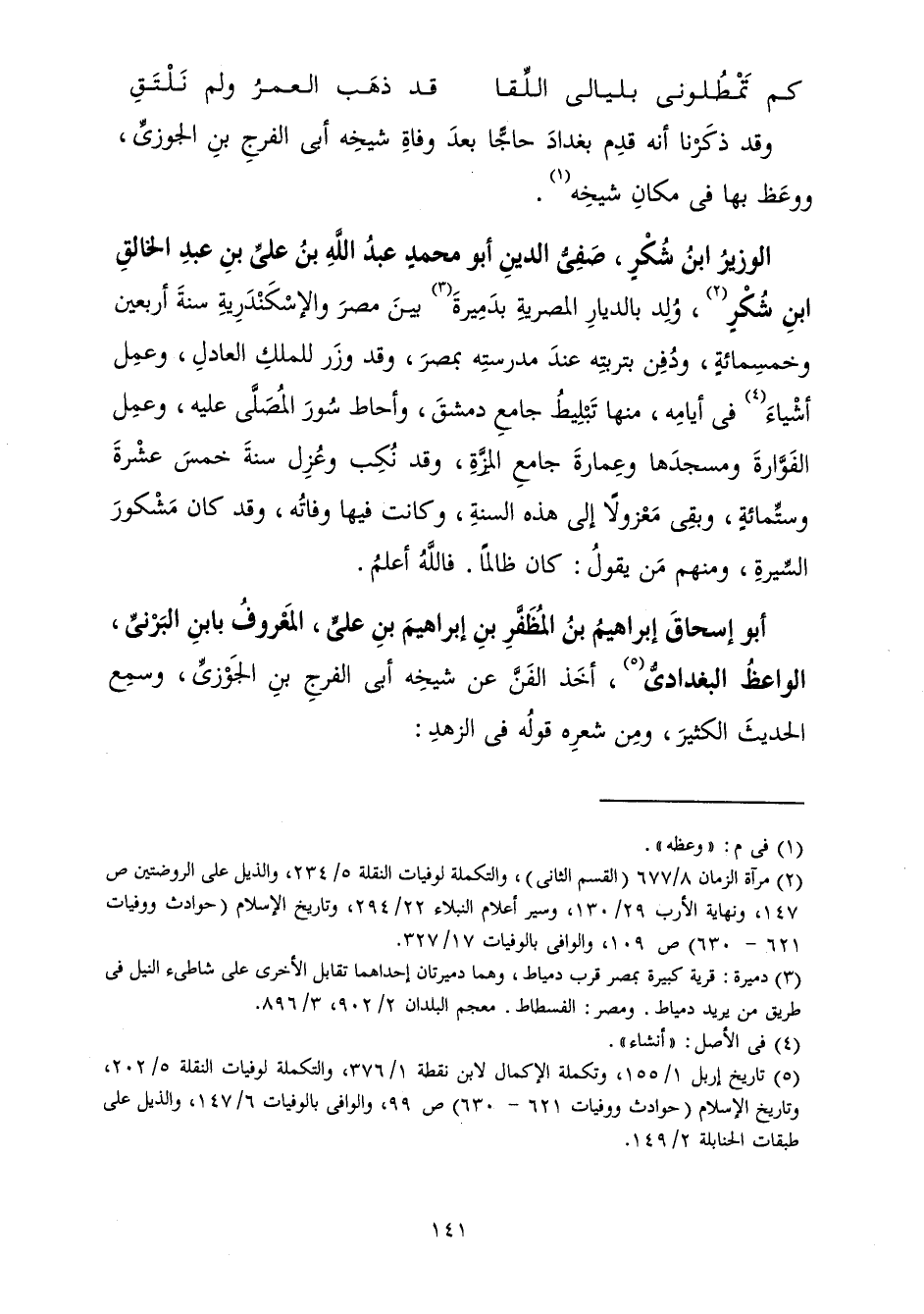 الْوَزِيرُ ابْنُ شُكْرٍ، صَفِيُّ الدِّينِ أَبُو مُحَمَّدٍ عَبْدُ اللَّهِ بْنُ عَلِيِّ بْنِ عَبْدِ الْخَالِقِ بْنِ شُكْرٍ، وُلِدَ بِالدِّيَارِ الْمِصْرِيَّةِ بِدَمِيرَةَ بَيْنَ مِصْرَ وَالْإِسْكَنْدَرِيَّةِ سَنَةَ أَرْبَعِينَ وَخَمْسِمِائَةٍ، وَدُفِنَ بِتُرْبَتِهِ عِنْدَ مَدْرَسَتِهِ بِمِصْرَ، وَقَدْ وَزَرَ لِلْمَلِكِ الْعَادِلِ، وَعَمِلَ أَشْيَاءَ فِي أَيَّامِهِ، مِنْهَا تَبْلِيطُ جَامَعِ دِمَشْقَ، وَأَحَاطَ سُورَ الْمُصَلَّى عَلَيْهِ، وَعَمِلَ الْفَوَّارَةَ وَمَسْجِدَهَا وَعِمَارَةَ جَامِعِ الْمِزَّةِ، وَقَدْ نُكِبَ وَعُزِلَ سَنَةَ خَمْسَ عَشْرَةَ وَسِتِّمِائَةٍ، وَبَقِيَ مَعْزُولًا إِلَى هَذِهِ السَّنَةِ، فَكَانَتْ فِيهَا وَفَاتُهُ، وَقَدْ كَانَ مَشْكُورَ السِّيرَةِ، وَمِنْهُمْ مَنْ يَقُولُ: كَانَ ظَالِمًا، فَاللَّهُ أَعْلَمُ.