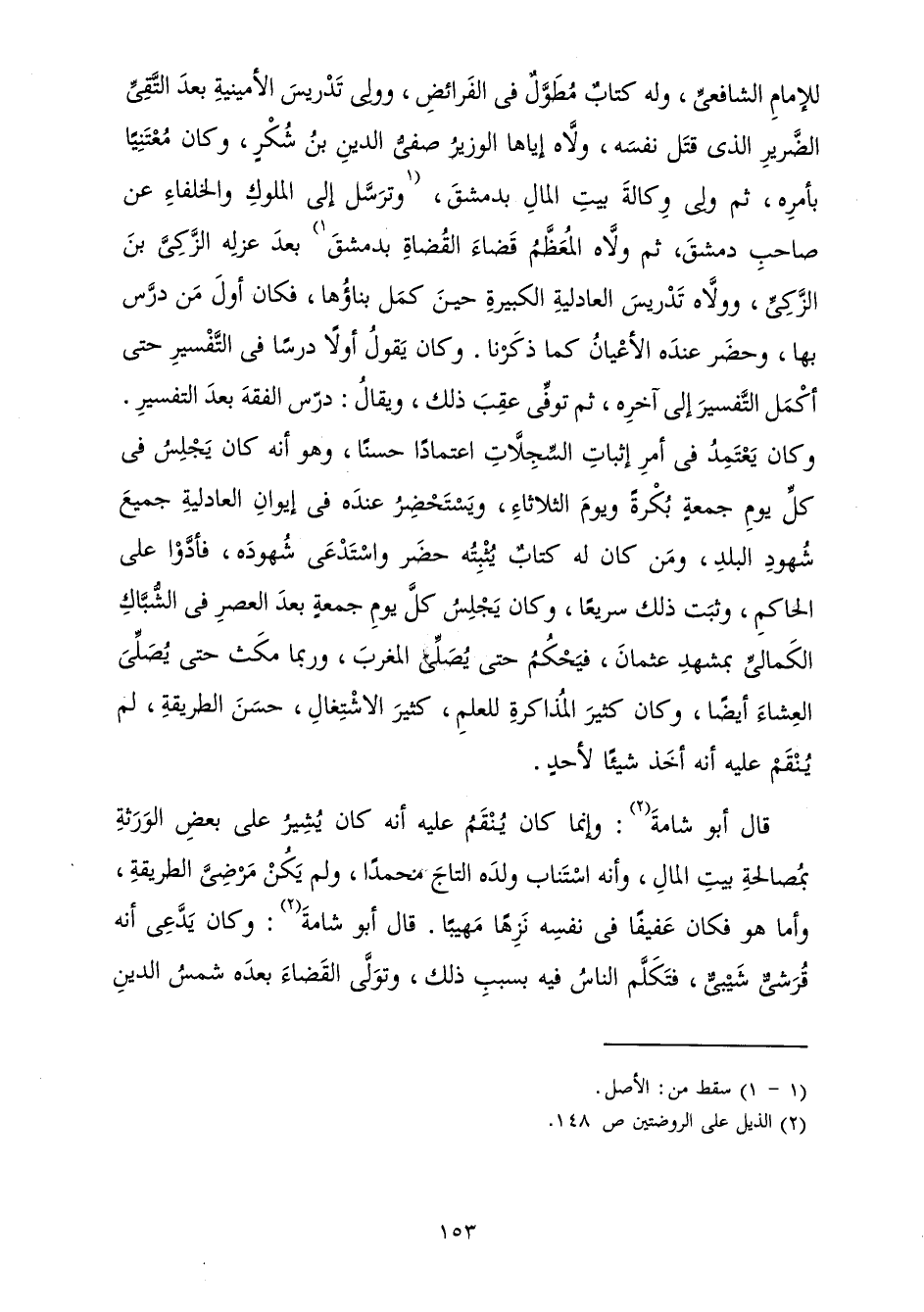 لِلْإِمَامِ الشَّافِعِيِّ، وَلَهُ كِتَابٌ مُطَوَّلٌ فِي الْفَرَائِضِ، وَوَلِيَ تَدْرِيسَ الْأَمِينِيَّةِ بَعْدَ التَّقِيِّ صَالِحِ الضَّرِيرِ الَّذِي قَتَلَ نَفْسَهُ، وَلَّاهُ إِيَّاهَا الْوَزِيرُ صَفِيُّ الدِّينِ بْنُ شُكْرٍ، وَكَانَ مُعْتَنِيًا بِأَمْرِهِ. ثُمَّ وَلِيَ وِكَالَةَ بَيْتِ الْمَالِ بِدِمَشْقَ، وَتَرَسَّلَ إِلَى الْمُلُوكِ وَالْخُلَفَاءِ عَنْ صَاحِبِ دِمَشْقَ، ثُمَّ وَلَّاهُ الْمُعَظَّمُ قَضَاءَ الْقُضَاةِ بِدِمَشْقَ بَعْدَ عَزْلِهِ الزَّكِيَّ بْنَ الزَّكِيِّ، وَوَلَّاهُ تَدْرِيسَ الْعَادِلِيَّةِ الْكَبِيرَةِ حِينَ كَمَلَ بِنَاؤُهَا، فَكَانَ أَوَّلَ مَنْ دَرَّسَ بِهَا، وَحَضَرَ عِنْدَهُ الْأَعْيَانُ كَمَا ذَكَرْنَا.