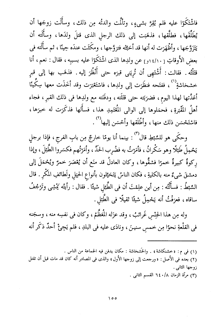 فَاشْتَكَوْا عَلَيْهِ فَلَمْ يُقِرَّ بِشَيْءٍ، وَتَأَلَّمَتْ وَالِدَتُهُ مِنْ ذَلِكَ، وَسَأَلَتْ زَوْجَهَا أَنْ يُطْلِّقَهَا، فَطَلَّقَهَا، فَذَهَبَتْ إِلَى ذَلِكَ الرَّجُلِ الَّذِي قَتَلَ وَلَدَهَا، وَسَأَلَتْهُ أَنْ يَتَزَوَّجَهَا، وَأَظْهَرَتْ لَهُ أَنَّهَا أَحَبَّتْهُ فَتَزَوَّجَهَا، وَمَكَثَتْ عِنْدَهُ حِينًا، ثُمَّ سَأَلَتْهُ فِي بَعْضِ الْأَوْقَاتِ عَنْ وَلَدِهَا الَّذِي اشْتَكَوْا عَلَيْهِ بِسَبَبِهِ، فَقَالَ: نَعَمْ، أَنَا قَتَلْتُهُ. فَقَالَتْ: أَشْتَهِي أَنْ تُرِيَنِي قَبْرَهُ حَتَّى أَنْظُرَ إِلَيْهِ. فَذَهَبَ بِهَا إِلَى قَبْرٍ خَشْخَاشَةٍ، فَفَتَحَهُ فَنَظَرَتْ إِلَى وَلَدِهَا، فَاسْتَعْبَرَتْ وَقَدْ أَخَذَتْ مَعَهَا سِكِّينًا أَعَدَّتْهَا لِهَذَا الْيَوْمِ، فَضَرَبَتْهُ حَتَّى قَتَلَتْهُ، وَدَفَنَتْهُ مَعَ وَلَدِهَا فِي ذَلِكَ الْقَبْرِ، فَجَاءَ أَهْلُ الْمَقْبَرَةِ، فَحَمَلُوهَا إِلَى الْوَالِي الْمُعْتَمِدِ هَذَا، فَسَأَلَهَا فَذَكَرَتْ لَهُ خَبَرَهَا، فَاسْتَحْسَنَ ذَلِكَ مِنْهَا، وَأَطْلَقَهَا وَأَحْسَنَ إِلَيْهَا.