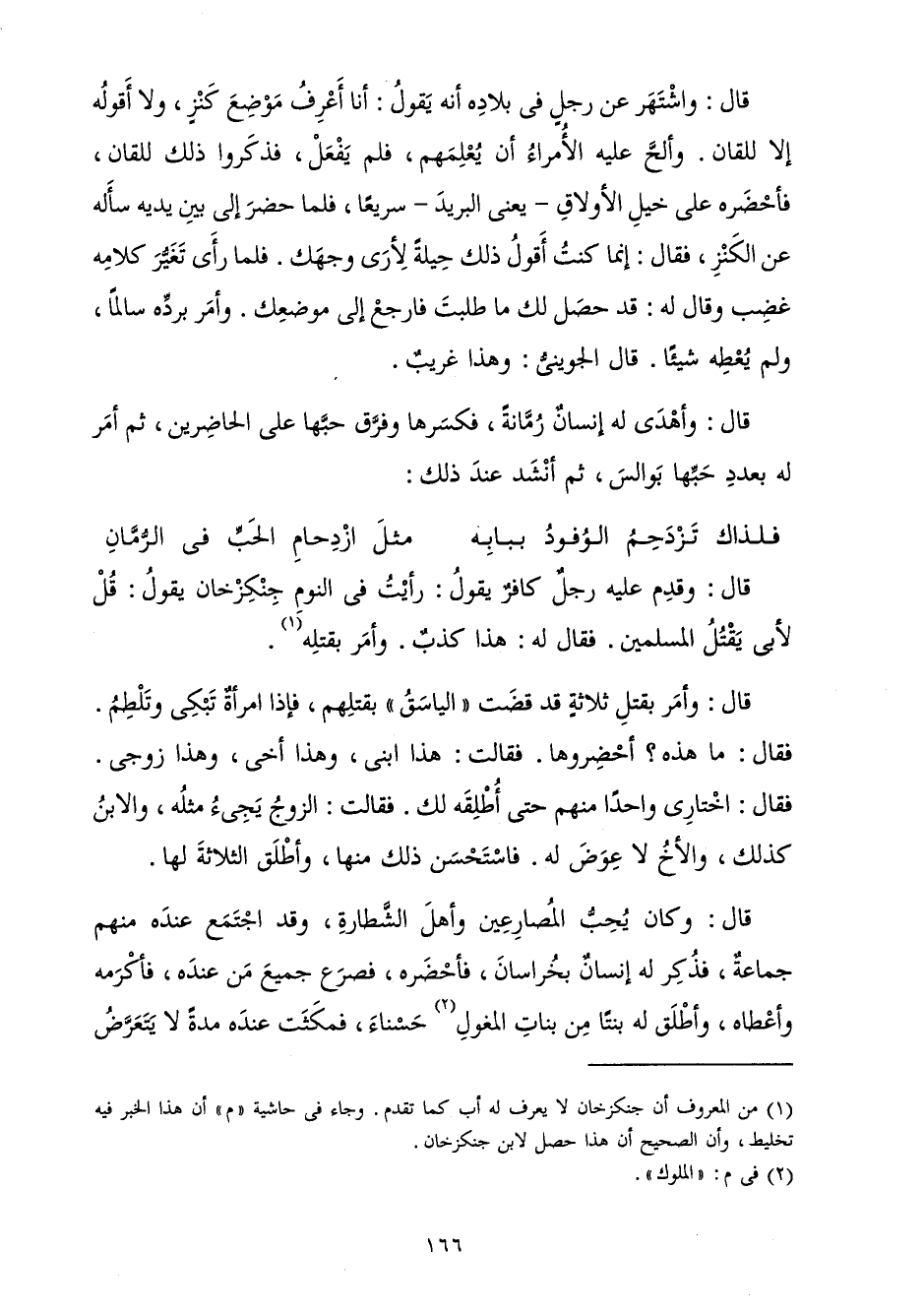 قَالَ: وَاشْتُهِرَ عَنْ رَجُلٍ فِي بِلَادِهِ أَنَّهُ يَقُولُ: أَنَا أَعْرِفُ مَوْضِعَ كَنْزٍ، وَلَا أَقُولُهُ إِلَّا لِلْقَانِ. وَأَلَحَّ عَلَيْهِ الْأُمَرَاءُ أَنْ يُعْلِمَهُمْ، فَلَمْ يَفْعَلْ، فَذَكَرُوا ذَلِكَ لِلْقَانِ، فَأَحْضَرَهُ عَلَى خَيْلِ الْأَوْلَاقِ - يَعْنِي الْبَرِيدَ - سَرِيعًا، فَلَمَّا حَضَرَ إِلَى بَيْنِ يَدَيْهِ سَأَلَهُ عَنِ الْكَنْزِ، فَقَالَ: إِنَّمَا كُنْتُ أَقُولُ ذَلِكَ حِيلَةً لِأَرَى وَجْهَكَ. فَلَمَّا رَأَى تَغَيُّرَ كَلَامِهِ غَضِبَ، وَقَالَ لَهُ: قَدْ حَصَلَ لَكَ مَا طَلَبْتَ فَارْجِعْ إِلَى مَوْضِعِكَ، وَأَمَرَ بِرَدِّهِ سَالِمًا، وَلَمْ يُعْطِهِ شَيْئًا. قَالَ الْجُوَيْنِيُّ: وَهَذَا غَرِيبٌ.