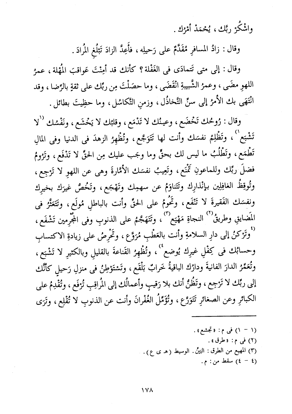 وَقَالَ: إِلَى مَتَى تَتَمَادَى فِي الْغَفْلَةِ؟ كَأَنَّكَ قَدْ أَمِنْتَ عَوَاقِبَ الْمُهْلَةِ، عُمْرُ اللَّهْوِ مَضَى، وَعُمْرُ الشَّبِيبَةِ انْقَضَى، وَمَا حَصَلْتَ مِنْ رَبِّكَ عَلَى ثِقَةٍ بِالرِّضَا، وَقَدِ انْتَهَى بِكَ الْأَمْرُ إِلَى سِنِّ التَّخَاذُلِ، وَزَمَنِ التَّكَاسُلِ، وَمَا حَظِيتَ بِطَائِلٍ.