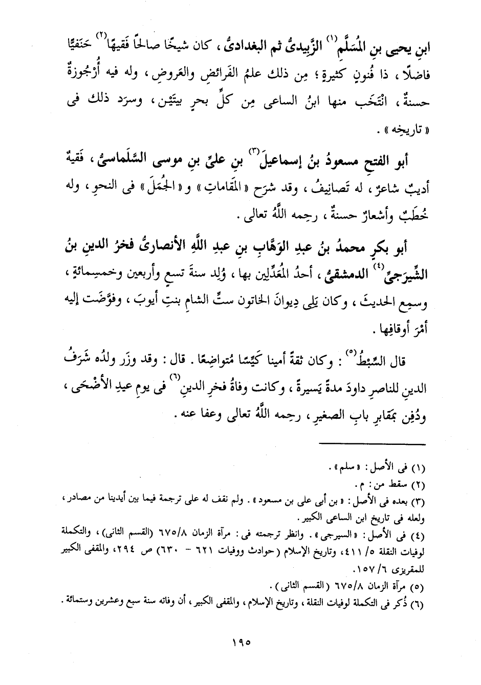 بْنِ يَحْيَى بْنِ مُسْلِمٍ الزَّبِيدِيُّ، ثُمَّ الْبَغْدَادِيُّ، كَانَ شَيْخًا صَالِحًا حَنَفِيًّا فَاضِلًا، ذَا فُنُونٍ كَثِيرَةٍ; وَمِنْ ذَلِكَ عِلْمُ الْفَرَائِضِ وَالْعَرُوضِ، وَلَهُ فِيهِ أُرْجُوزَةٌ حَسَنَةٌ، انْتَخَبَ مِنْهَا ابْنُ السَّاعِي مِنْ كُلِّ بَحْرِ بَيْتَيْنِ، وَسَرَدَ ذَلِكَ فِي " تَارِيخِهِ ".