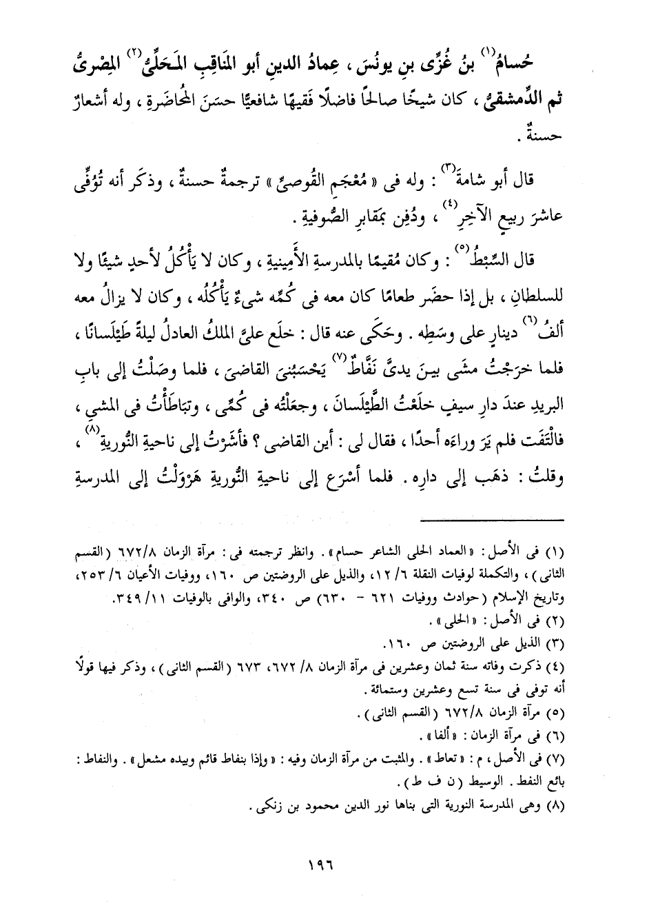 حُسَامُ بْنُ غُزِّيِّ، بْنِ يُونُسَ عِمَادُ الدِّينِ أَبُو الْمَنَاقِبِ الْمَحَلِّيُّ الْمِصْرِيُّ ثُمَّ الدِّمَشْقِيُّ، كَانَ شَيْخًا صَالِحًا فَاضِلًا فَقِيهًا شَافِعِيًّا حَسَنَ الْمُحَاضَرَةِ، وَلَهُ أَشْعَارٌ حَسَنَةٌ.