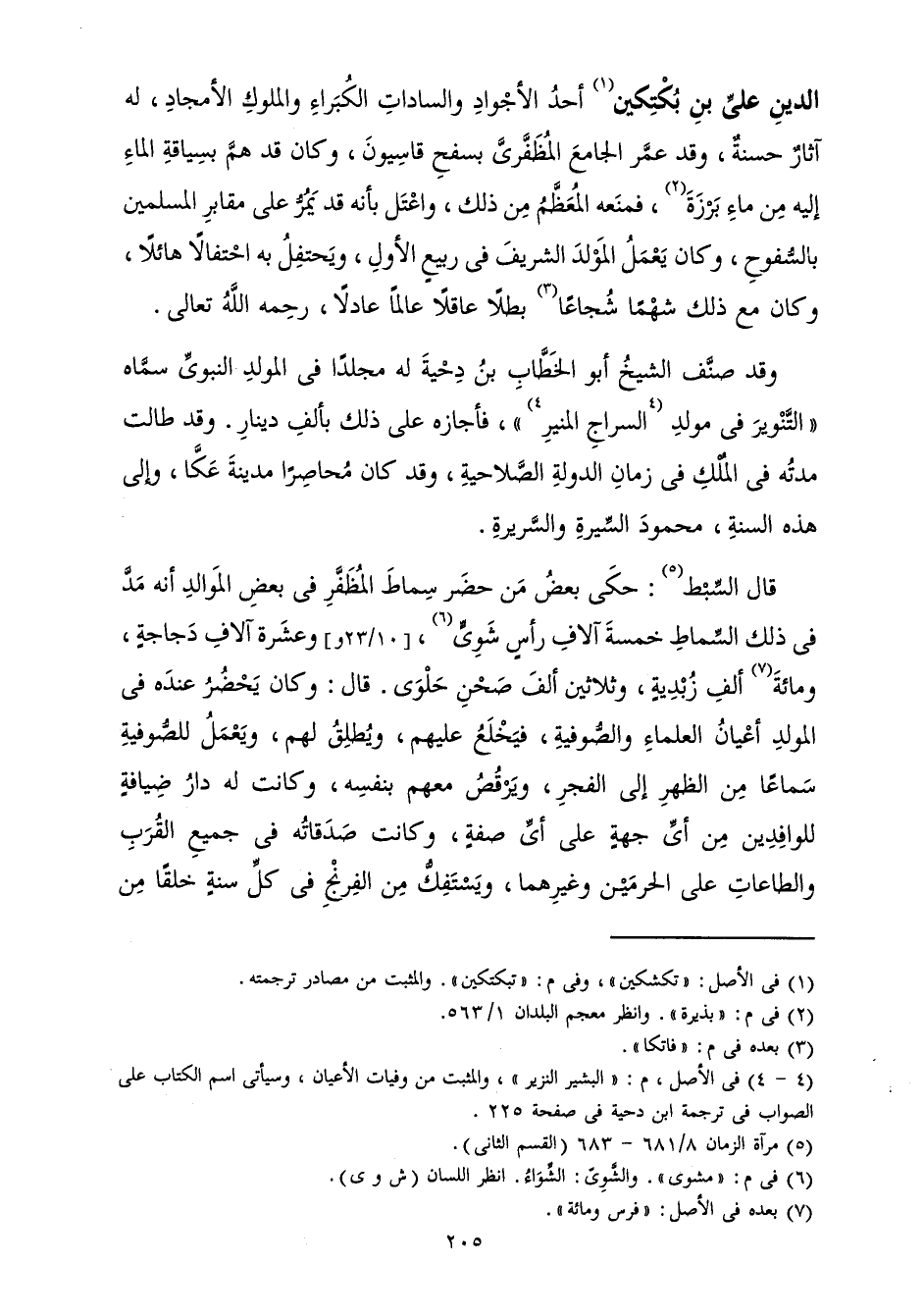 الدِّينِ عَلِيِّ بْنِ بُكْتِكِينَ أَحَدُ الْأَجْوَادِ وَالسَّادَاتِ الْكُبَرَاءِ وَالْمُلُوكِ الْأَمْجَادِ، لَهُ آثَارٌ حَسَنَةٌ، وَقَدْ عَمَّرَ الْجَامِعَ الْمُظَفَّرِيَّ بِسَفْحِ قَاسِيُونَ، وَكَانَ قَدْ هَمَّ بِسِيَاقَةِ الْمَاءِ إِلَيْهِ مِنْ مَاءِ بَرْزَةَ، فَمَنَعَهُ الْمُعَظَّمُ مِنْ ذَلِكَ، وَاعْتَلَّ بِأَنَّهُ قَدْ يَمُرُّ عَلَى مَقَابِرِ الْمُسْلِمِينَ بِالسُّفُوحِ، وَكَانَ يَعْمَلُ الْمَوْلِدَ الشَّرِيفَ فِي رَبِيعٍ الْأَوَّلِ، وَيَحْتَفِلُ بِهِ احْتِفَالًا هَائِلًا. وَكَانَ مَعَ ذَلِكَ شَهْمًا شُجَاعًا بَطَلًا عَاقِلًا عَالِمًا عَادِلًا - رَحِمَهُ اللَّهُ تَعَالَى -.