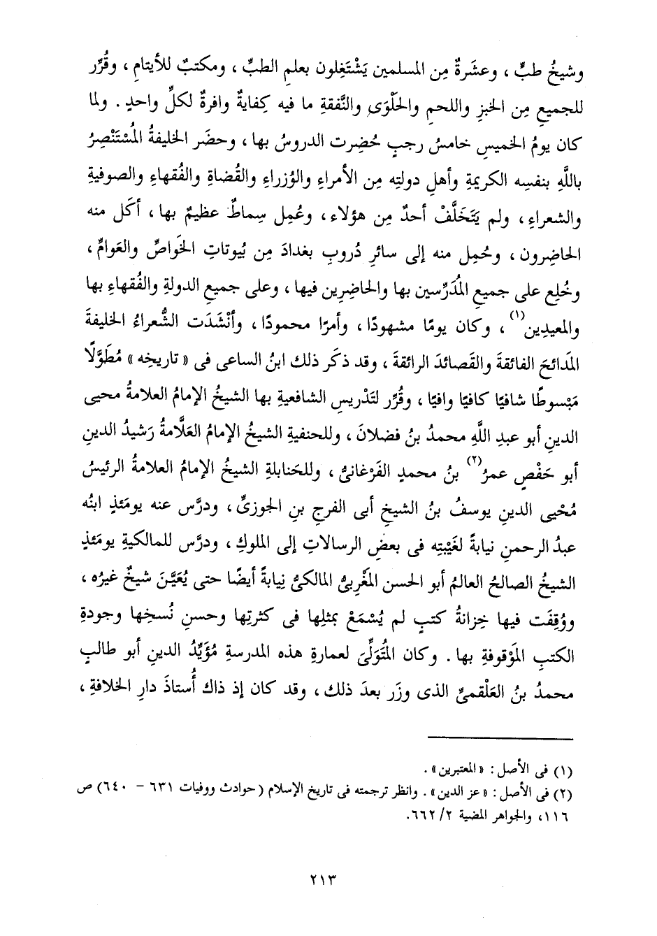 وَشَيْخُ طِبٍّ وَعَشَرَةٌ مِنَ الْمُسْلِمِينَ يَشْتَغِلُونَ بِعِلْمِ الطِّبِّ، وَمَكْتَبٌ لِلْأَيْتَامِ، وَقُرِّرَ لِلْجَمِيعِ مِنَ الْخُبْزِ وَاللَّحْمِ وَالْحَلْوَى وَالنَّفَقَةِ مَا فِيهِ كِفَايَةٌ وَافِرَةٌ لِكُلِّ وَاحِدٍ. وَلَمَّا كَانَ يَوْمُ الْخَمِيسِ خَامِسَ رَجَبٍ حُضِرَتِ الدُّرُوسُ بِهَا، وَحَضَرَ الْخَلِيفَةُ الْمُسْتَنْصِرُ بِاللَّهِ بِنَفْسِهِ الْكَرِيمَةِ وَأَهْلُ دَوْلَتِهِ مِنَ الْأُمَرَاءِ وَالْوُزَرَاءِ وَالْقُضَاةِ وَالْفُقَهَاءِ وَالصُّوفِيَّةِ وَالشُّعَرَاءِ، وَلَمْ يَتَخَلَّفْ أَحَدٌ مِنْ هَؤُلَاءِ، وَعُمِلَ سِمَاطٌ عَظِيمٌ بِهَا، أَكَلَ مِنْهُ الْحَاضِرُونَ، وَحُمِلَ مِنْهُ إِلَى سَائِرِ دُرُوبِ بَغْدَادَ مِنْ بُيُوتَاتِ الْخَوَاصِّ وَالْعَوَامِّ، وَخُلِعَ عَلَى جَمِيعِ الْمُدَرِّسِينَ بِهَا وَالْحَاضِرِينَ فِيهَا، وَعَلَى جَمِيعِ الدَّوْلَةِ وَالْفُقَهَاءِ وَالْمُعِيدِينَ، وَكَانَ يَوْمًا مَشْهُودًا، وَأَنْشَدَتِ الشُّعَرَاءُ الْخَلِيفَةَ الْمَدَائِحَ الْفًائِقَةَ وَالْقَصَائِدَ الرَّائِقَةَ. وَقَدْ ذَكَرَ ذَلِكَ ابْنُ السَّاعِي فِي تَارِيخِهِ مُطَوَّلًا مَبْسُوطًا شَافِيًا كَافِيًا وَافِيًا، وَقُرِّرَ لِتَدْرِيسِ الشَّافِعِيَّةِ بِهَا الْإِمَامُ مُحْيِي الدِّينِ أَبُو عَبْدِ اللَّهِ بْنُ فَضْلَانَ، وَلِلْحَنَفِيَّةِ الْإِمَامُ الْعَلَّامَةُ رَشِيدُ الدِّينِ أَبُو حَفْصٍ عُمَرُ بْنُ مُحَمَّدٍ الْفَرْغَانِيُّ، وَلِلْحَنَابِلَةِ الْإِمَامُ الْعَالِمُ مُحْيِي الدِّينِ يُوسُفُ بْنُ الشَّيْخِ أَبِي الْفَرَجِ بْنِ الْجَوْزِيِّ، وَدَرَّسَ عَنْهُ يَوْمَئِذٍ ابْنُهُ عَبْدُ الرَّحْمَنِ نِيَابَةً لِغَيْبَتِهِ فِي بَعْضِ الرِّسَالَاتِ إِلَى الْمُلُوكِ، وَدَرَّسَ لِلْمَالِكِيَّةِ يَوْمَئِذٍ الشَّيْخُ الصَّالِحُ الْعَالِمُ أَبُو الْحَسَنِ الْمَغْرِبِيُّ الْمَالِكِيُّ نِيَابَةً أَيْضًا حَتَّى يُعَيَّنَ شَيْخٌ غَيْرُهُ. وَوُقِفَتْ خَزَائِنُ كُتُبٍ لَمْ يُسْمَعْ بِمِثْلِهَا فِي كَثْرَتِهَا وَحُسْنِ نُسَخِهَا وَجَوْدَةِ الْكُتُبِ الْمَوْقُوفَةِ بِهَا. وَكَانَ الْمُتَوَلِّيَ لِعِمَارَةِ هَذِهِ الْمَدْرَسَةِ مُؤَيِّدُ الدِّينِ أَبُو طَالِبٍ مُحَمَّدُ بْنُ الْعَلْقَمِيِّ الَّذِي وَزَرَ بَعْدَ ذَلِكَ، وَقَدْ كَانَ إِذْ ذَاكَ أُسْتَاذَ دَارِ الْخِلَافَةِ،