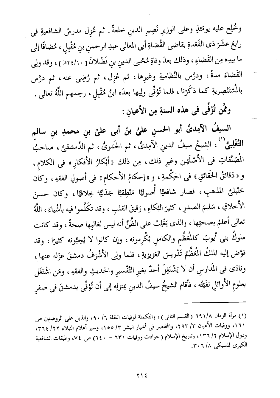 وَمِمَّنْ تُوُفِّيَ فِي هَذِهِ السَّنَةِ مِنَ الْأَعْيَانِ السَّيْفُ الْآمِدِيُّ أَبُو الْحَسَنِ عَلِيُّ بْنُ أَبِي عَلِيِّ، بْنِ مُحَمَّدِ بْنِ سَالِمٍ التَّغْلِبِيُّ، الشَّيْخُ سَيْفُ الدِّينِ الْآمِدِيُّ، ثُمَّ الْحَمَوِيُّ، ثُمَّ الدِّمَشْقِيُّ، صَاحِبُ الْمُصَنَّفَاتِ فِي الْأَصْلَيْنِ وَغَيْرِ ذَلِكَ، مِنْ ذَلِكَ " أَبْكَارُ الْأَفْكَارِ " فِي الْكَلَامِ، وَ " دَقَائِقُ الْحَقَائِقِ " فِي الْحِكْمَةِ، وَ " إِحْكَامُ الْأَحْكَامِ " فِي أُصُولِ الْفِقْهِ، وَكَانَ حَنْبَلِيَّ الْمَذْهَبِ، فَصَارَ شَافِعِيًّا أُصُولِيًّا مَنْطِقِيًّا جَدَلِيًّا خِلَافِيًّا، وَكَانَ حَسَنَ الْأَخْلَاقِ، سَلِيمَ الصَّدْرِ، كَثِيرَ الْبُكَاءِ، رَقِيقَ الْقَلْبِ، وَقَدْ تَكَلَّمُوا فِيهِ بِأَشْيَاءَ، اللَّهُ تَعَالَى أَعْلَمُ بِصِحَّتِهَا، وَالَّذِي يَغْلُبُ عَلَى الظَّنِّ أَنَّهُ لَيْسَ لِغَالِبِهَا صِحَّةٌ، وَقَدْ كَانَتْ مُلُوكُ بَنِي أَيُّوبَ كَالْمُعَظَّمِ وَالْكَامِلِ يُكْرِمُونَهُ، وَإِنْ كَانُوا لَا يُحِبُّونَهُ كَثِيرًا. وَقَدْ فَوَّضَ إِلَيْهِ الْمُعَظَّمُ تَدْرِيسَ الْعَزِيزِيَّةِ، فَلَمَّا وَلِيَ الْأَشْرَفُ دِمَشْقَ عَزَلَهُ عَنْهَا، وَنَادَى بِالْمَدَارِسِ أَنْ لَا يَشْتَغِلَ أَحَدٌ بِغَيْرِ التَّفْسِيرِ وَالْحَدِيثِ وَالْفِقْهِ، وَمَنِ اشْتَغَلَ بِعُلُومِ الْأَوَائِلِ نَفَيْتُهُ، فَأَقَامَ الشَّيْخُ سَيْفُ الدِّينِ بِمَنْزِلِهِ إِلَى أَنْ تُوُفِّيَ بِدِمَشْقَ فِي صَفَرٍ