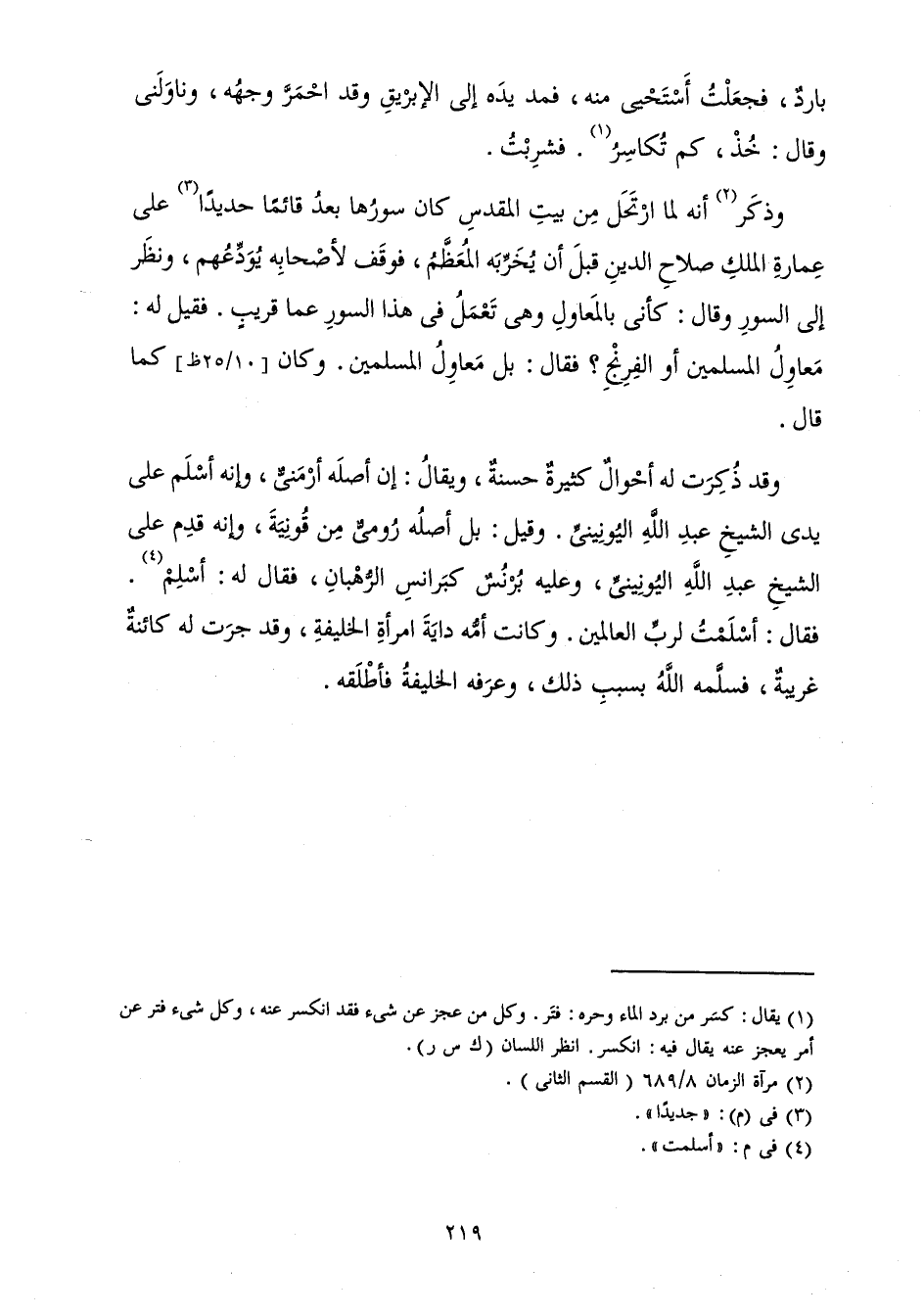 وَقَدْ ذُكِرَتْ لَهُ أَحْوَالٌ كَثِيرَةٌ حَسَنَةٌ. وَيُقَالُ: إِنَّ أَصْلَهُ أَرْمَنِيٌّ، وَإِنَّهُ أَسْلَمَ عَلَى يَدَيِ الشَّيْخِ عَبْدِ اللَّهِ الْيُونِينِيِّ. وَقِيلَ: بَلْ أَصْلُهُ رُومِيٌّ مِنْ قُونِيَةَ، وَأَنَّهُ قَدِمَ عَلَى الشَّيْخِ عَبْدِ اللَّهِ الْيُونِينِيِّ، وَعَلَيْهِ بُرْنُسٌ كَبَرَانِسِ الرُّهْبَانِ، فَقَالَ لَهُ: أَسْلِمْ. فَقَالَ: أَسْلَمْتُ لِرَبِّ الْعَالَمِينَ. وَقَدْ كَانَتْ أُمُّهُ دَايَةُ امْرَأَةِ الْخَلِيفَةِ، وَقَدْ جَرَتْ لَهُ كَائِنَةٌ غَرِيبَةٌ، فَسَلَّمَهُ اللَّهُ بِسَبَبِ ذَلِكَ، وَعَرَفَهُ الْخَلِيفَةُ فَأَطْلَقَهُ.