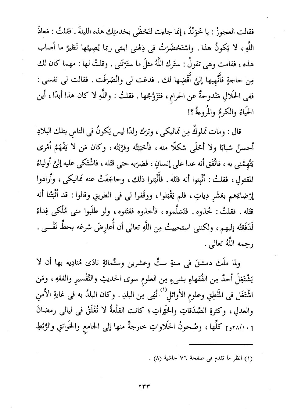 قَالَ: وَمَاتَ مَمْلُوكٌ مِنْ مَمَالِيكِي، وَتَرَكَ وَلَدًا لَيْسَ يَكُونُ فِي النَّاسِ بِتِلْكَ الْبِلَادِ أَحْسَنُ شَبَابًا وَلَا أَحْلَى شَكْلًا مِنْهُ، فَأَحْبَبْتُهُ وَقَرَّبْتُهُ، وَكَانَ مَنْ لَا يَفْهَمُ أَمْرِي يَتَّهِمُنِي بِهِ، فَاتَّفَقَ أَنَّهُ عَدَا عَلَى إِنْسَانٍ، فَضَرَبَهُ حَتَّى قَتَلَهُ، فَاشْتَكَى عَلَيْهِ إِلَيَّ أَوْلِيَاءُ الْمَقْتُولِ، فَقُلْتُ: أَثْبِتُوا أَنَّهُ قَتَلَهُ. فَأَثْبَتُوا ذَلِكَ، وَحَاجَفَتْ عَنْهُ مَمَالِيكِي، وَأَرَادُوا إِرْضَاءَهُمْ بِعَشْرِ دِيَاتٍ، فَلَمْ يَقْبَلُوا، وَوَقَفُوا لِي فِي الطَّرِيقِ وَقَالُوا: قَدْ أَثْبَتْنَا أَنَّهُ قَتَلَهُ. فَقُلْتُ: خُذُوهُ. فَتَسَلَّمُوهُ، فَقَتَلُوهُ، وَلَوْ طَلَبُوا مِنِّي مُلْكِي فِدَاءً لَهُ لَدَفَعْتُهُ إِلَيْهِمْ، وَلَكِنِ اسْتَحْيَيْتُ مِنَ اللَّهِ أَنْ أُعَارِضَ شَرْعَهُ بِحَظِّ نَفْسِي. رَحِمَهُ اللَّهُ تَعَالَى.