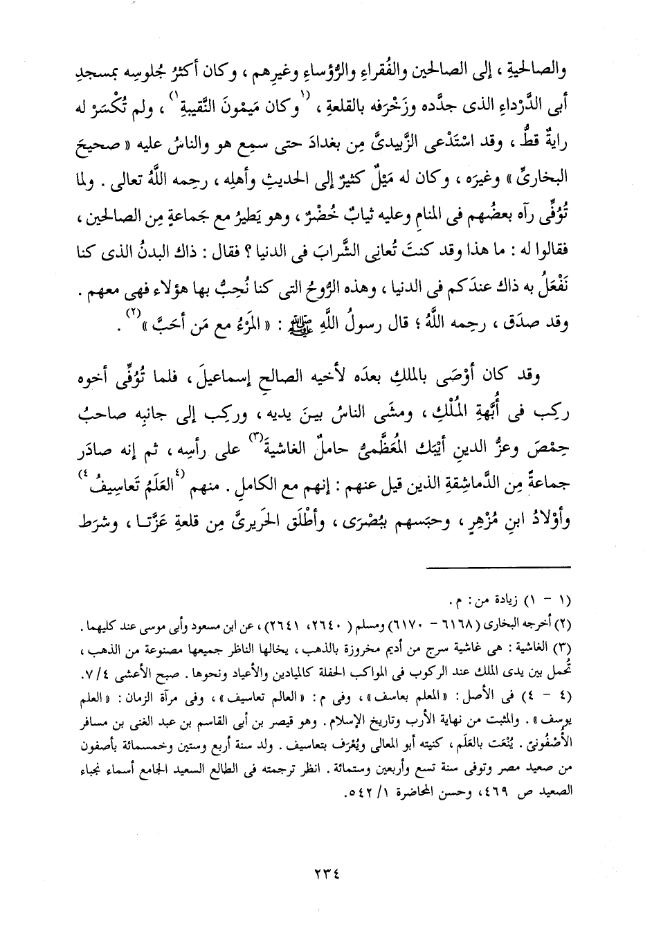 وَالصَّالِحِيَّةِ، إِلَى الصَّالِحِينَ وَالْفُقَرَاءِ وَالرُّؤَسَاءِ وَغَيْرِهِمْ. وَكَانَ أَكْثَرُ جُلُوسِهِ بِمَسْجِدِ أَبِي الدَّرْدَاءِ الَّذِي جَدَّدَهُ وَزَخْرَفَهُ بِالْقَلْعَةِ، وَكَانَ مَيْمُونَ النَّقِيبَةِ، وَلَمْ تُكْسَرْ لَهُ رَايَةٌ قَطُّ، وَقَدِ اسْتَدْعَى الزَّبِيدِيَّ مِنْ بَغْدَادَ حَتَّى سَمِعَ هُوَ وَالنَّاسُ عَلَيْهِ " صَحِيحَ الْبُخَارِيِّ " وَغَيْرَهُ، وَكَانَ لَهُ مَيْلٌ كَثِيرٌ إِلَى الْحَدِيثِ وَأَهْلِهِ، وَلَمَّا تُوُفِّيَ رَحِمَهُ اللَّهُ رَآهُ بَعْضُهُمْ فِي الْمَنَامِ، وَعَلَيْهِ ثِيَابٌ خُضْرٌ، وَهُوَ يَطِيرُ مَعَ جَمَاعَةٍ مِنَ الصَّالِحِينَ، فَقَالُوا لَهُ: مَا هَذَا وَقَدْ كُنْتَ تُعَانِي الشَّرَابَ فِي الدُّنْيَا؟ فَقَالَ: ذَاكَ الْبَدَنُ الَّذِي كُنَّا نَفْعَلُ بِهِ ذَاكَ عِنْدَكُمْ فِي الدُّنْيَا، وَهَذِهِ الرُّوحُ الَّتِي كُنَّا نُحِبُّ بِهَا هَؤُلَاءِ، فَهِيَ مَعَهُمْ. وَلَقَدْ صَدَقَ، رَحِمَهُ اللَّهُ; قَالَ رَسُولُ اللَّهِ صَلَّى اللَّهُ عَلَيْهِ وَسَلَّمَ: «الْمَرْءُ مَعَ مَنْ أَحَبَّ» .