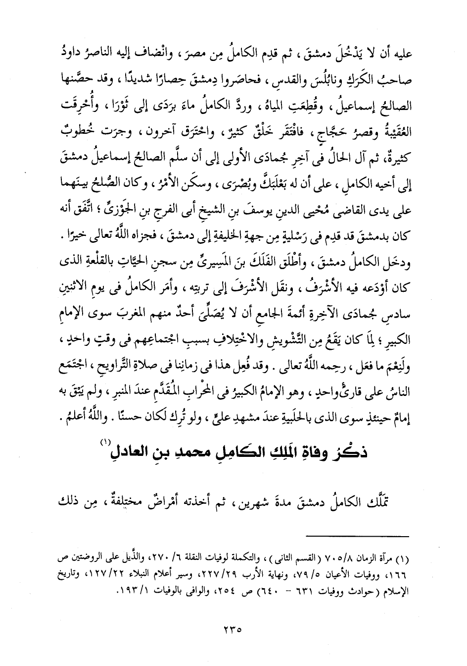 عَلَيْهِ أَنْ لَا يَدْخُلَ دِمَشْقَ، ثُمَّ قَدِمَ الْكَامِلُ مِنْ مِصْرَ، وَانْضَافَ إِلَيْهِ النَّاصِرُ دَاوُدُ صَاحِبُ الْكَرَكِ وَنَابُلُسَ وَالْقُدْسِ، فَحَاصَرُوا دِمَشْقَ حِصَارًا شَدِيدًا، وَقَدْ حَصَّنَهَا الصَّالِحُ إِسْمَاعِيلُ، وَقُطِعَتِ الْمِيَاهُ، وَرَدَّ الْكَامِلُ مَاءَ بَرَدَى إِلَى ثَوْرَا، وَأُحْرَقَتِ الْعُقَيْبَةُ وَقَصْرُ حَجَّاجٍ، فَافْتَقَرَ خَلْقٌ كَثِيرٌ، وَاحْتَرَقَ آخَرُونَ، وَجَرَتْ خُطُوبٌ كَثِيرَةٌ، ثُمَّ آلَ الْحَالُ فِي آخِرِ جُمَادَى الْأُولَى إِلَى أَنْ سَلَّمَ الصَّالِحُ إِسْمَاعِيلُ دِمَشْقَ إِلَى أَخِيهِ الْكَامِلِ، عَلَى أَنَّ لَهُ بَعْلَبَكَّ وَبُصْرَى، وَسَكَنَ الْأَمْرُ، وَكَانَ الصُّلْحُ بَيْنَهُمَا عَلَى يَدَيِ الْقَاضِي مُحْيِي الدِّينِ يُوسُفَ بْنِ الشَّيْخِ أَبِي الْفَرَجِ بْنِ الْجَوْزِيِّ، اتَّفَقَ أَنَّهُ كَانَ بِدِمَشْقَ قَدْ قَدِمَ فِي رَسْلِيَّةٍ مِنْ جِهَةِ الْخَلِيفَةِ إِلَى دِمَشْقَ، فَجَزَاهُ اللَّهُ تَعَالَى خَيْرًا. وَدَخَلَ الْكَامِلُ دِمَشْقَ، وَأَطْلَقَ الْفَلَكَ بْنَ الْمَسِيرِيِّ مِنْ سِجْنِ الْحَيَّاتِ بِالْقَلْعَةِ الَّذِي كَانَ أَوْدَعَهُ فِيهِ الْأَشْرَفُ، وَنُقِلَ الْأَشْرَفُ إِلَى تُرْبَتِهِ، وَأَمَرَ الْكَامِلُ فِي يَوْمِ الِاثْنَيْنِ سَادِسِ جُمَادَى الْآخِرَةِ أَئِمَّةَ الْجَامِعِ أَنْ لَا يُصَلِّيَ أَحَدٌ مِنْهُمُ الْمَغْرِبَ سِوَى الْإِمَامِ الْكَبِيرِ; لِمَا كَانَ يَقَعُ مِنَ التَّشْوِيشِ وَالِاخْتِلَافِ بِسَبَبِ اجْتِمَاعِهِمْ فِي وَقْتٍ وَاحِدٍ، وَلَنِعْمَ مَا فَعَلَ - رَحِمَهُ اللَّهُ تَعَالَى - وَقَدْ فُعِلَ هَذَا فِي زَمَانِنَا فِي صَلَاةِ التَّرَاوِيحِ، اجْتَمَعَ النَّاسُ عَلَى قَارِئٍ وَاحِدٍ، وَهُوَ الْإِمَامُ الْكَبِيرُ فِي الْمِحْرَابِ الْمُقَدَّمِ عِنْدَ الْمِنْبَرِ، وَلَمْ يَبْقَ بِهِ إِمَامٌ حِينَئِذٍ سِوَى الَّذِي بِالْحَلَبَيَّةِ عِنْدَ مَشْهَدِ عَلَيٍّ، وَلَوْ تُرِكَ لَكَانَ حَسَنًا. وَاللَّهُ أَعْلَمُ.