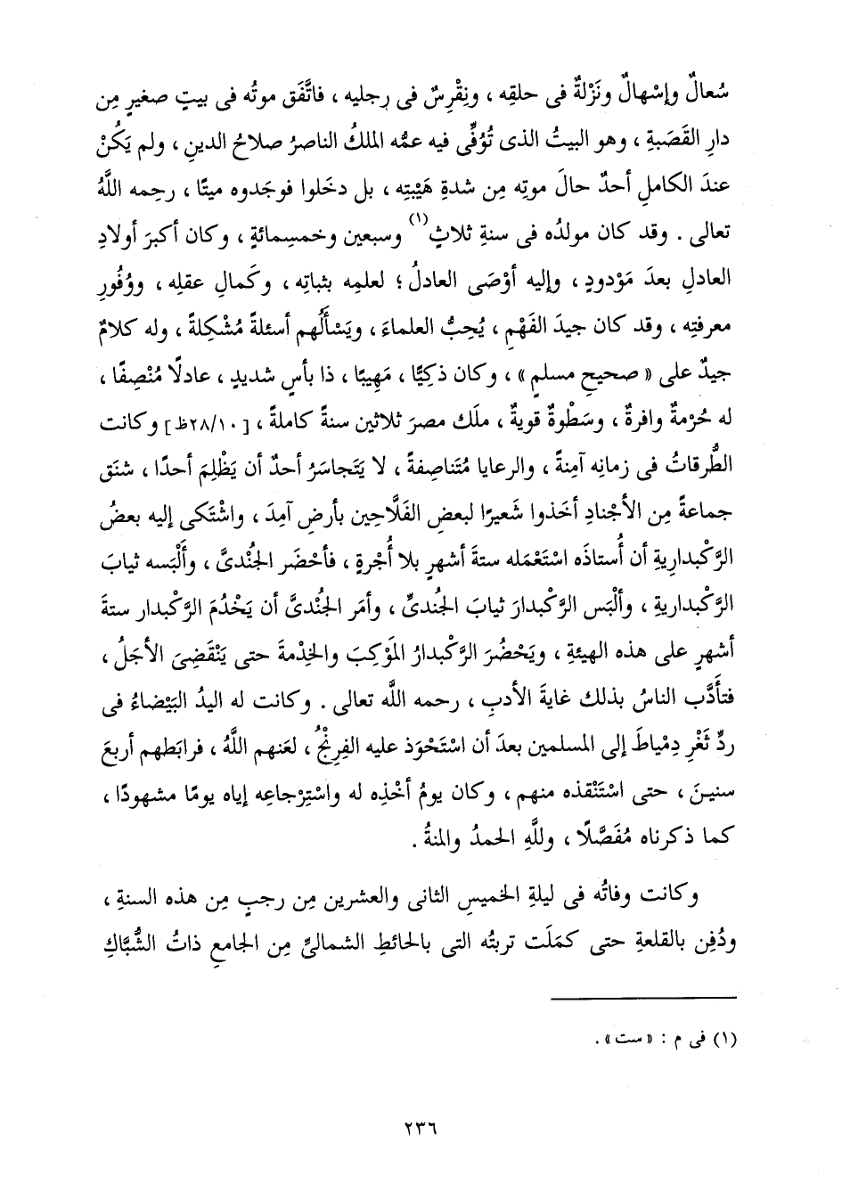 سُعَالٌ وَإِسْهَالٌ وَنَزْلَةٌ فِي حَلْقِهِ، وَنِقْرِسٌ فِي رِجْلَيْهِ، فَاتَّفَقَ مَوْتُهُ فِي بَيْتٍ صَغِيرٍ مِنْ دَارِ الْقَصَبَةِ، وَهُوَ الْبَيْتُ الَّذِي تُوُفِّيَ فِيهِ عَمُّهُ الْمَلِكُ النَّاصِرُ صَلَاحُ الدِّينِ. وَلَمْ يَكُنْ عِنْدَ الْكَامِلِ أَحَدٌ عِنْدَ مَوْتِهِ مِنْ شِدَّةِ هَيْبَتِهِ، بَلْ دَخَلُوا فَوَجَدُوهُ مَيِّتًا - رَحِمَهُ اللَّهُ تَعَالَى -. وَقَدْ كَانَ مَوْلِدُهُ فِي سَنَةِ ثَلَاثٍ وَسَبْعِينَ وَخَمْسِمِائَةٍ، وَكَانَ أَكْبَرَ أَوْلَادِ الْعَادِلِ بَعْدَ مَوْدُودٍ، وَإِلَيْهِ أَوْصَى الْعَادِلُ لِعِلْمِهِ بِثَبَاتِهِ، وَكَمَالِ عَقْلِهِ، وَوُفُورِ مَعْرِفَتِهِ. وَقَدْ كَانَ جَيِّدَ الْفَهْمِ يُحِبُّ الْعُلَمَاءَ، وَيَسْأَلُهُمْ أَسْئِلَةً مُشْكِلَةً، وَلَهُ كَلَامٌ جَيِّدٌ عَلَى صَحِيحِ مُسْلِمٍ، وَكَانَ ذَكِيًّا، مَهِيبًا، ذَا بَأْسٍ شَدِيدٍ، عَادِلًا مُنْصِفًا، لَهُ حُرْمَةٌ وَافِرَةٌ، وَسَطْوَةٌ قَوِيَّةٌ، مَلَكَ مِصْرَ ثَلَاثِينَ سَنَةً كَامِلَةً، وَكَانَتِ الطُّرُقَاتُ فِي زَمَانِهِ آمِنَةً، وَالرَّعَايَا مُتَنَاصِفَةً، لَا يَتَجَاسَرُ أَحَدٌ أَنْ يَظْلِمَ أَحَدًا، شَنَقَ جَمَاعَةً مِنَ الْأَجْنَادِ أَخَذُوا شَعِيرًا لِبَعْضِ الْفَلَّاحِينَ بِأَرْضِ آمِدَ، وَاشْتَكَى إِلَيْهِ بَعْضُ الرَّكْبَدَارِيَةِ أَنَّ أُسْتَاذَهُ اسْتَعْمَلَهُ سِتَّةَ أَشْهُرٍ بِلَا أُجْرَةٍ، فَأَحْضَرَ الْجُنْدِيَّ وَأَلْبَسَهُ ثِيَابَ الرَّكْبَدَارِيَةِ، وَأَلْبَسَ الرَّكْبَدَارَ ثِيَابَ الْجُنْدِيِّ، وَأَمَرَ الْجُنْدِيَّ أَنْ يَخْدُمَ الرَّكْبَدَارَ سِتَّةَ أَشْهُرٍ عَلَى هَذِهِ الْهَيْئَةِ، وَيَحْضُرَ الرَّكْبَدَارُ الْمَوْكِبَ وَالْخِدْمَةَ حَتَّى يَنْقَضِيَ الْأَجَلُ، فَتَأَدَّبَ النَّاسُ بِذَلِكَ غَايَةَ الْأَدَبِ، رَحِمَهُ اللَّهُ تَعَالَى. وَكَانَتْ لَهُ الْيَدُ الْبَيْضَاءُ فِي رَدِّ ثَغْرِ دِمْيَاطَ إِلَى الْمُسْلِمِينَ بَعْدَ أَنِ اسْتَحْوَذَ عَلَيْهِ الْفِرِنْجُ - لَعَنَهُمُ اللَّهُ - فَرَابَطَهُمْ أَرْبَعَ سِنِينَ، حَتَّى اسْتَنْقَذَهُ مِنْهُمْ، وَكَانَ يَوْمُ أَخْذِهِ لَهُ وَاسْتِرْجَاعِهِ إِيَّاهُ يَوْمًا مَشْهُودًا، كَمَا ذَكَرْنَا مُفَصَّلًا، وَلِلَّهِ الْحَمْدُ وَالْمِنَّةُ.