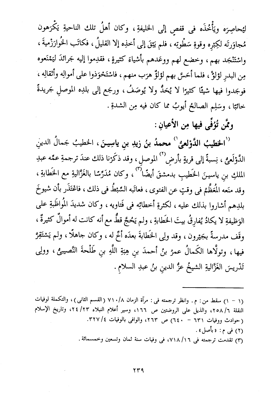 الْخَطِيبُ الدَّوْلَعِيُّ، مُحَمَّدُ بْنُ زَيْدِ بْنِ يَاسِينَ، الْخَطِيبُ جَمَالُ الدِّينِ الدَّوْلَعِيُّ، نِسْبَةً إِلَى قَرْيَةٍ بِأَرْضِ الْمَوْصِلِ، وَقَدْ ذَكَرْنَا ذَلِكَ عِنْدَ تَرْجَمَةِ عَمِّهِ عَبْدِ الْمَلِكِ بْنِ يَاسِينَ الْخَطِيبِ بِدِمَشْقَ أَيْضًا، وَكَانَ مُدَرِّسًا بِالْغَزَّالِيَّةِ مَعَ الْخَطَابَةِ، وَقَدْ مَنَعَهُ الْمُعَظَّمُ فِي وَقْتٍ عَنِ الْفَتْوَى، فَعَاتَبَهُ السِّبْطُ فِي ذَلِكَ، فَاعْتَذَرَ بِأَنَّ شُيُوخَ بَلَدِهِ هُمُ الَّذِينَ أَشَارُوا عَلَيْهِ بِذَلِكَ لِكَثْرَةِ أَخْطَائِهِ فِي فَتَاوِيهِ، وَقَدْ كَانَ شَدِيدَ الْمُوَاظَبَةِ عَلَى الْوَظِيفَةِ لَا يَكَادُ يُفَارِقُ بَيْتَ الْخَطَابَةِ، وَلَمْ يَحُجَّ قَطُّ مَعَ أَنَّهُ كَانَتْ لَهُ أَمْوَالٌ كَثِيرَةٌ، وَقَفَ مَدْرَسَةً بَجَيْرُونَ، وَقَدْ وَلِيَ الْخَطَابَةَ بَعْدَهُ أَخٌ لَهُ، وَكَانَ جَاهِلًا وَلَمْ يَسْتَقِرَّ فِيهَا، وَتَوَلَّاهَا الْكَمَالُ بْنُ عُمَرَ بْنِ أَحْمَدَ بْنِ هِبَةِ اللَّهِ بْنِ طَلْحَةَ النَّصِيبِيُّ، وَوَلِيَ تَدْرِيسَ الْغَزَّالِيَّةَ الشَّيْخُ عِزُّ الدِّينِ بْنُ عَبْدِ السَّلَامِ.