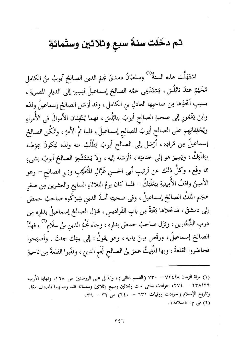 اسْتَهَلَّتْ هَذِهِ السَّنَةُ وَسُلْطَانُ دِمَشْقَ نَجْمُ الدِّينِ الصَّالِحُ أَيُّوبُ بْنُ الْكَامِلِ مُخَيِّمٌ عِنْدَ نَابُلُسَ، يَسْتَدْعِي عَمَّهُ الصَّالِحَ إِسْمَاعِيلَ لِيَسِيرَ إِلَى الدِّيَارِ الْمِصْرِيَّةِ، بِسَبَبِ أَخْذِهَا مِنْ صَاحِبِهَا الْعَادِلِ بْنِ الْكَامِلِ، وَقَدْ أَرْسَلَ الصَّالِحُ إِسْمَاعِيلُ وَلَدَهُ وَابْنَ يَغْمُورٍ إِلَى صُحْبَةِ الصَّالِحِ أَيُّوبَ بِنَابُلُسَ، فَهُمَا يُنْفِقَانِ الْأَمْوَالَ فِي الْأُمَرَاءِ وَيُحْلِفَانِهِمْ عَلَى الصَّالِحِ أَيُّوبَ لِلصَّالِحِ إِسْمَاعِيلَ، فَلَمَّا تَمَّ الْأَمْرُ، وَتَمَكَّنَ الصَّالِحُ إِسْمَاعِيلُ مِنْ مُرَادِهِ، أَرْسَلَ إِلَى الصَّالِحِ أَيُّوبَ يَطْلُبُ مِنْهُ وَلَدَهُ لِيَكُونَ عِوَضَهُ بِبَعْلَبَكَّ، وَيَسِيرُ هُوَ إِلَى خِدْمَتِهِ، فَأَرْسَلَهُ إِلَيْهِ، وَلَا يَسْتَشْعِرُ الصَّالِحُ أَيُّوبُ بِشَيْءٍ مِمَّا وَقَعَ لَهُ، وَكُلُّ ذَلِكَ عَنْ تَرْتِيبِ أَبِي الْحَسَنِ غَزَّالٍ الْمُتَطَبِّبِ وَزِيرِ الصَّالِحِ، وَهُوَ الْأَمِينُ وَاقِفُ الْأَمِينِيَّةِ بِبَعْلَبَكَّ، فَلَمَّا كَانَ يَوْمُ الثُّلَاثَاءِ السَّابِعِ وَالْعِشْرِينَ مِنْ صَفَرٍ هَجَمَ الْمَلِكُ الصَّالِحُ إِسْمَاعِيلُ، وَفِي صُحْبَتِهِ أَسَدُ الدِّينِ شِيرْكُوهْ صَاحِبُ حِمْصَ إِلَى دِمَشْقَ، فَدَخَلَاهَا بَغْتَةً مِنْ بَابِ الْفَرَادِيسِ، فَنَزَلَ الصَّالِحُ إِسْمَاعِيلُ بِدَارِهِ مِنْ دَرْبِ الشَّعَّارِينَ، وَنَزَلَ صَاحِبُ حِمْصَ بِدَارِهِ، وَجَاءَ نَجْمُ الدِّينِ بْنُ سَلَامٍ، فَهَنَّأَ الصَّالِحَ إِسْمَاعِيلَ، وَرَقَصَ بَيْنَ يَدَيْهِ، وَهُوَ يَقُولُ: إِلَى بَيْتِكَ جِئْتُ. وَأَصْبَحُوا فَحَاصَرُوا الْقَلْعَةَ، وَبِهَا الْمُغِيثُ عُمَرُ بْنُ الصَّالِحِ نَجْمِ الدِّينِ، وَنَقَبُوا الْقَلْعَةَ مِنْ نَاحِيَةِ
