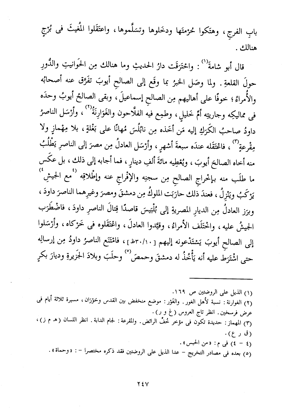 قَالَ أَبُو شَامَةَ: وَاحْتَرَقَتْ دَارُ الْحَدِيثِ وَمَا هُنَالِكَ مِنَ الْحَوَانِيتِ وَالدُّورِ حَوْلَ الْقَلْعَةِ، وَلَمَّا وَصَلَ الْخَبَرُ بِمَا وَقَعَ إِلَى الصَّالِحِ أَيُّوبَ تَفَرَّقَ عَنْهُ أَصْحَابُهُ وَالْأُمَرَاءُ; خَوْفًا عَلَى أَهَالِيهِمْ مِنَ الصَّالِحِ إِسْمَاعِيلَ، وَبَقِيَ الصَّالِحُ أَيُّوبُ وَحْدَهُ فِي مَمَالِيكِهِ وَجَارِيَتِهِ أُمِّ خَلِيلٍ، وَطَمِعَ فِيهِ الْفَلَّاحُونَ وَالْغَوَارِنَةُ، وَأَرْسَلَ النَّاصِرُ دَاوُدُ صَاحِبُ الْكَرَكِ إِلَيْهِ مَنْ أَخَذَهُ مِنْ نَابُلُسَ مُهَانًا عَلَى بَغْلَةٍ، بِلَا مِهْمَازٍ وَلَا مِقْرَعَةٍ، فَاعْتَقَلَهُ عِنْدَهُ سَبْعَةَ أَشْهُرٍ، وَأَرْسَلَ الْعَادِلُ مِنْ مِصْرَ إِلَى النَّاصِرِ يَطْلُبُ مِنْهُ أَخَاهُ الصَّالِحَ أَيُّوبَ، وَيُعْطِيهِ مِائَةَ أَلْفِ دِينَارٍ، فَمَا أَجَابَهُ إِلَى ذَلِكَ، بَلْ عَكَسَ مَا طُلِبَ مِنْهُ بِإِخْرَاجِ الصَّالِحِ مِنْ سَجْنِهِ وَالْإِفْرَاجِ عَنْهُ وَإِطْلَاقِهِ مَعَ الْجَيْشِ يَرْكَبُ وَيَنْزِلُ، فَعِنْدَ ذَلِكَ حَارَبَتِ الْمُلُوكُ مِنْ دِمَشْقَ وَمِصْرَ وَغَيْرِهِمَا النَّاصِرَ دَاوُدَ، وَبَرَزَ الْعَادِلُ مِنَ الدِّيَارِ الْمِصْرِيَّةِ إِلَى بُلْبَيْسَ قَاصِدًا قِتَالَ النَّاصِرِ دَاوُدَ، فَاضْطَرَبَ الْجَيْشُ عَلَيْهِ وَاخْتَلَفَتِ الْأُمَرَاءُ، وَقَيَّدُوا الْعَادِلَ، وَاعْتَقَلُوهُ فِي خَرْكَاهْ، وَأَرْسَلُوا إِلَى الصَّالِحِ أَيُّوبَ يَسْتَدْعُونَهُ إِلَيْهِمْ، فَامْتَنَعَ النَّاصِرُ دَاوُدُ مِنْ إِرْسَالِهِ حَتَّى اشْتَرَطَ عَلَيْهِ أَنَّهُ يَأْخُذُ لَهُ دِمَشْقَ وَحِمْصَ وَحَلَبَ وَبِلَادَ الْجَزِيرَةِ وَدِيَارَ بَكْرٍ