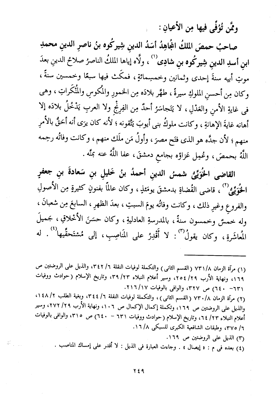 الْقَاضِي الْخُوَيِّيُّ شَمْسُ الدِّينِ أَحْمَدُ بْنُ خَلِيلِ، بْنِ سَعَادَةَ بْنِ جَعْفَرٍ الْخُوَيِّيُّ، قَاضِي الْقُضَاةِ بِدِمَشْقَ يَوْمَئِذٍ، وَكَانَ عَالِمًا بِفُنُونٍ كَثِيرَةٍ مِنَ الْأُصُولِ وَالْفُرُوعِ وَغَيْرِ ذَلِكَ، وَكَانَتْ وَفَاتُهُ يَوْمَ السَّبْتِ بَعْدَ الظُّهْرِ، السَّابِعِ مِنْ شَعْبَانَ، وَلَهُ خَمْسٌ وَخَمْسُونَ سَنَةً، بِالْمَدْرَسَةِ الْعَادِلِيَّةِ، وَكَانَ حَسَنَ الْأَخْلَاقِ، جَمِيلَ الْمُعَاشَرَةِ، وَكَانَ يَقُولُ: لَا أَقْدِرُ عَلَى إِيصَالِ الْمَنَاصِبِ، إِلَى مُسْتَحِقِّيهَا. لَهُ